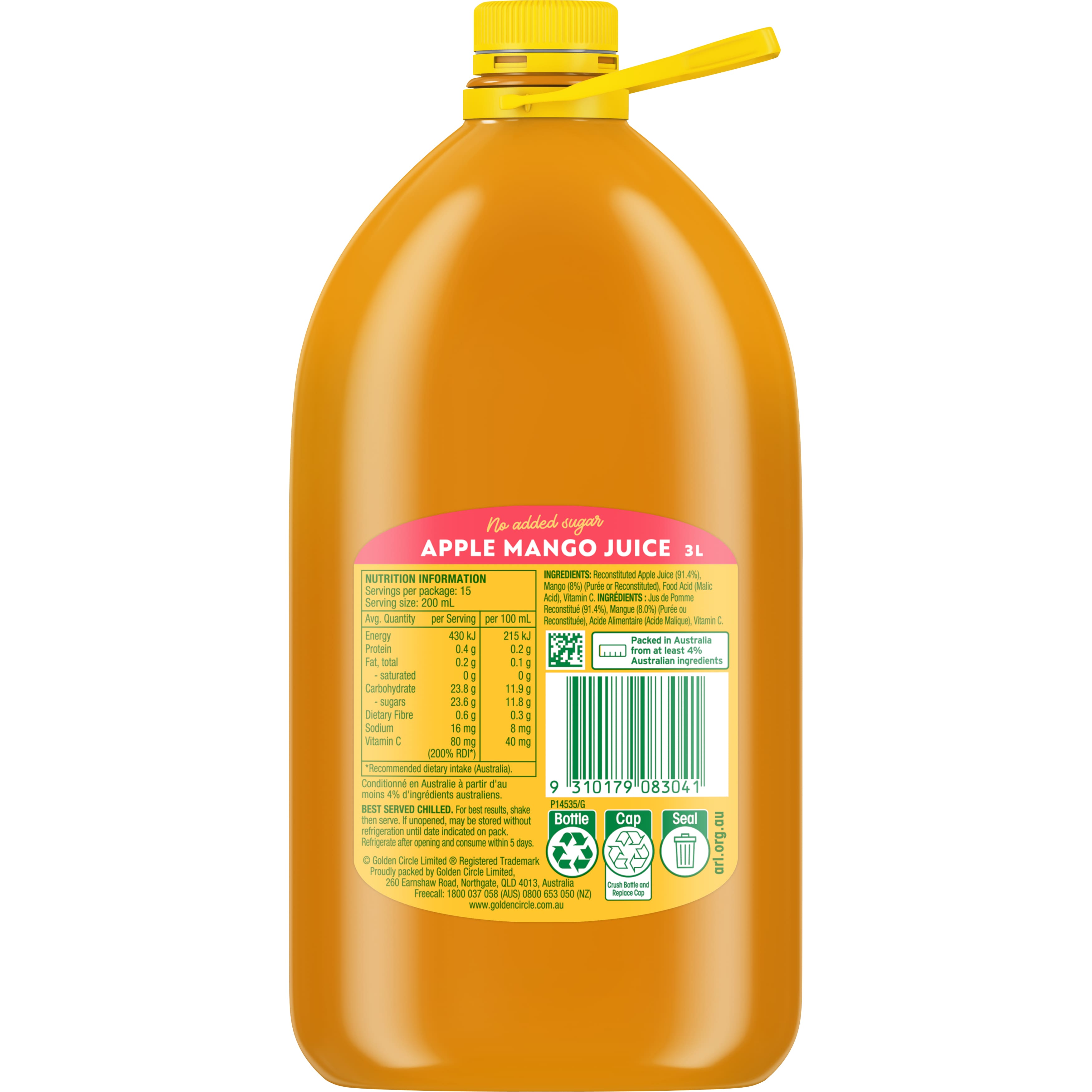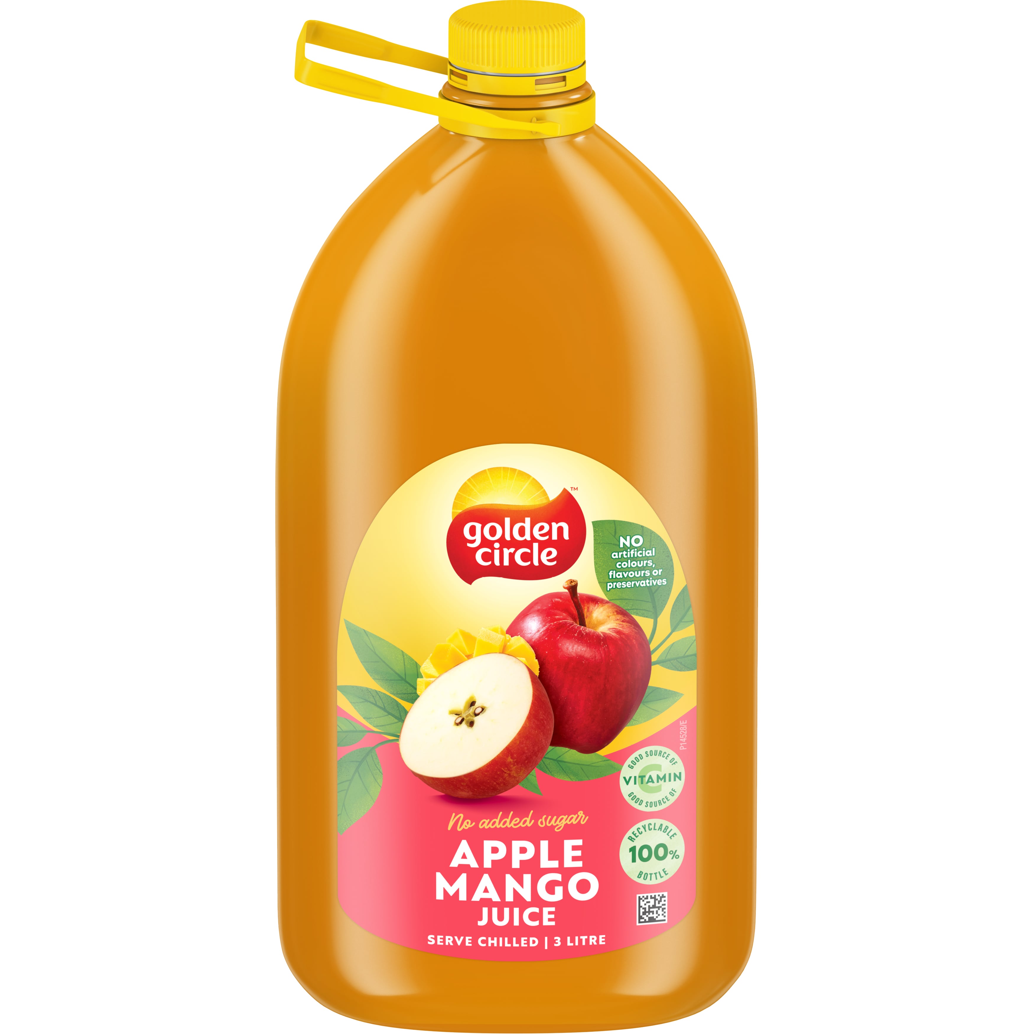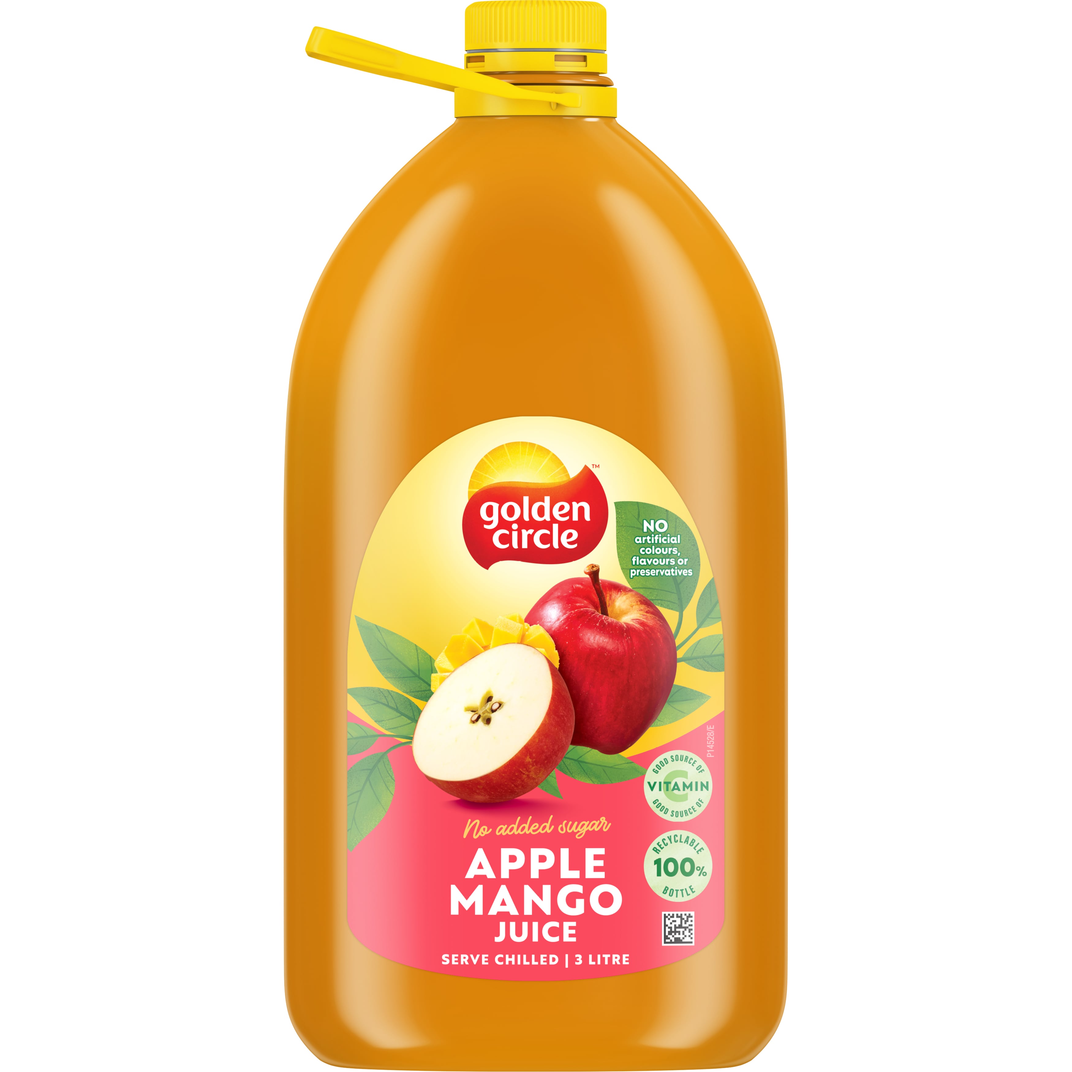 Quench your family's thirst and add a burst of fruity flavour to any occasion with Golden Circle® Apple Mango Juice. <b><b> Deliciously Refreshing <b><b> Say goodbye to artificial colours, flavours or preservatives and hello to a refreshingly delicious Apple Mango Juice that's perfect for any ocassion, throughout the day. The perfect mix of apple and mango, this classic fruity juice is a family favourite, made with no added sugar and is a good source of Vitamin C. <b><b> Family-Friendly & Versatile <b><b> Provide your family with a delicious and wholesome juice option that everyone will love. This apple mango juice is crafted to bring smiles, made with no added sugar. <b><b> Your Go-To for Every Occasion <b><b> Enjoy a glass of Golden Circle® Apple Mango Fruit Juice poured over ice, or mix with sparkling water for something a little more exciting. Golden Circle® Apple Mango Juice contains no artificial colours or flavours and is made with no preservatives either. <b><b> Trusted By Aussies <b><b> Golden Circle®, a name trusted by Australian families, has been sharing the sunshine for generations. Our Apple Mango Fruit Juice continues this tradition, offering a product that's not only delicious but also made with no added sugar. <b><b> • Delicious Apple Mango Juice Flavour: Enjoy the sweet and tangy combination of real fruit juice for a refreshing taste. • No Nasties: Free from artificial colours, flavours, and preservatives, giving you peace of mind with every sip. • Versatile Refreshment: Best served chilled, or transform into fun iceblocks for a delightful summer treat. • Made with no added sugar