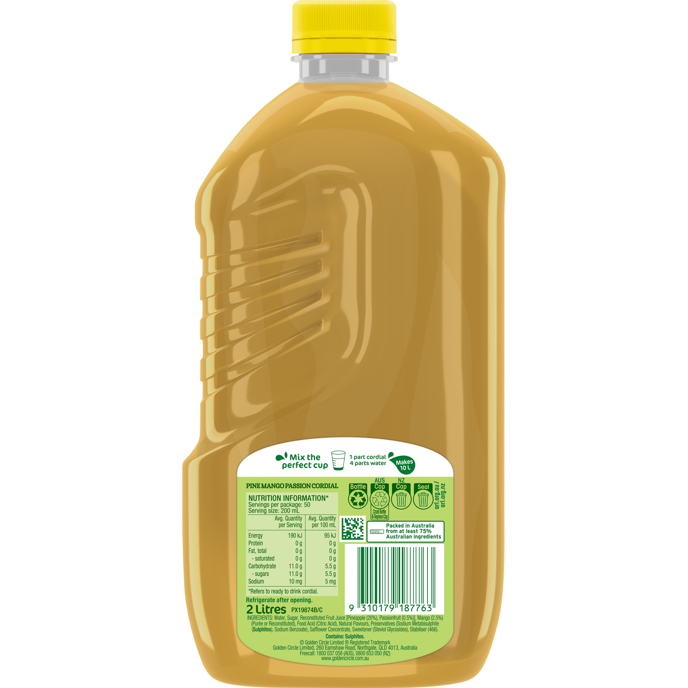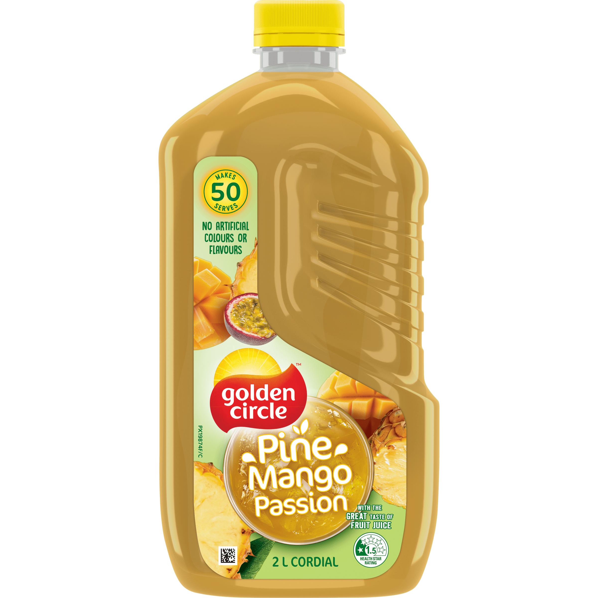 Golden Circle® Pine Mango Passion Cordial is made with no artificial colours or flavours. Mix the perfect cup with 1 part cordial and 4 parts water, or for something a bit special, why not try mixing it with sparkling water or lemonade. Combining the tropical fruit flavours of pineapple, mango and passionfruit with other ingredients, Golden Circle® Pine Mango Passion Cordial is a drink that the whole family will enjoy. With the great taste of fruit juice, this drink is excellent in fruit punches, ice blocks or simply mixed into a cold glass of water. Golden Circle®, Share the Sunshine. • No artificial colours or flavours • With the great taste of fruit juice • Mix the perfect cup – 1 part cordial, 4 parts water • Makes 10 litres • Try mixing with sparkling water
