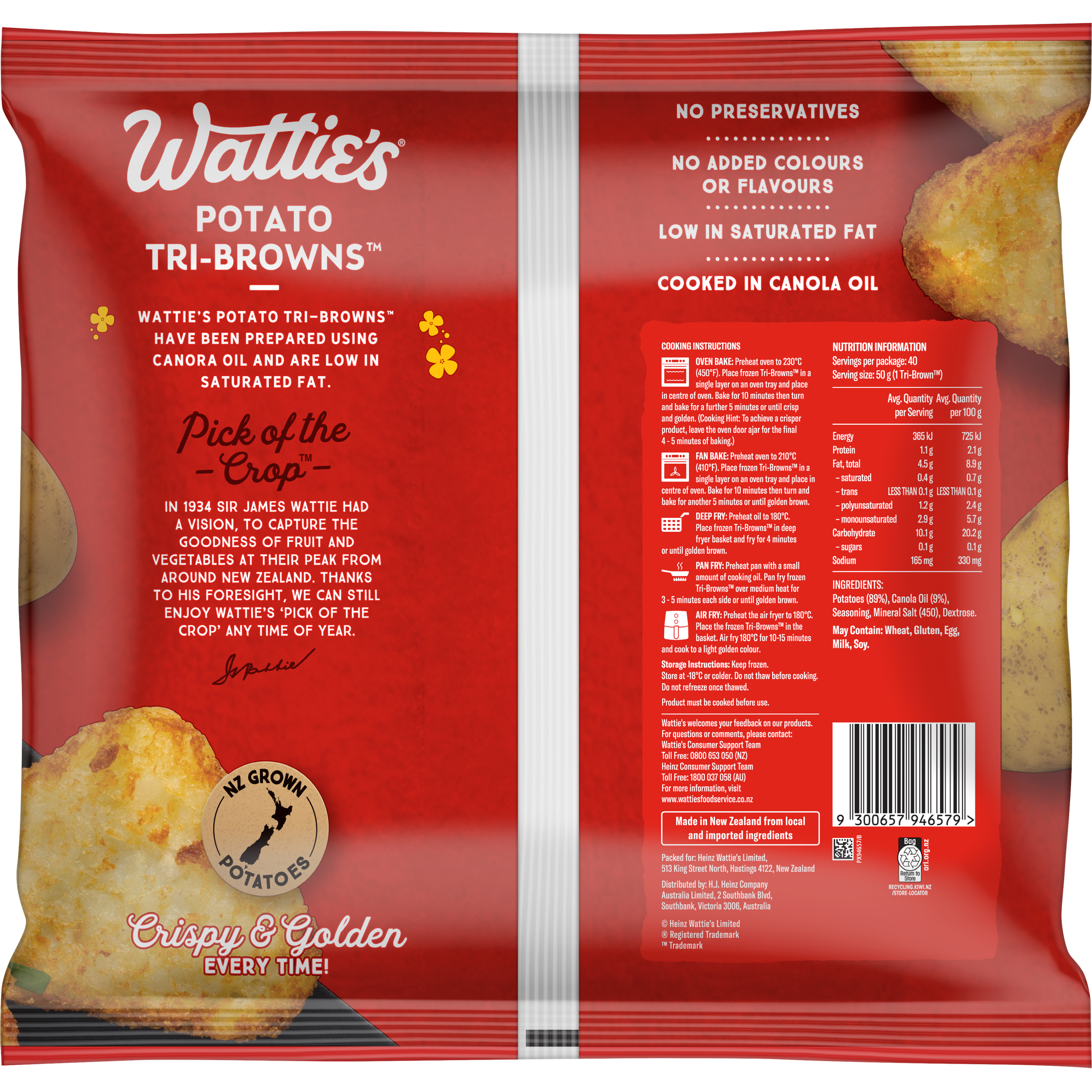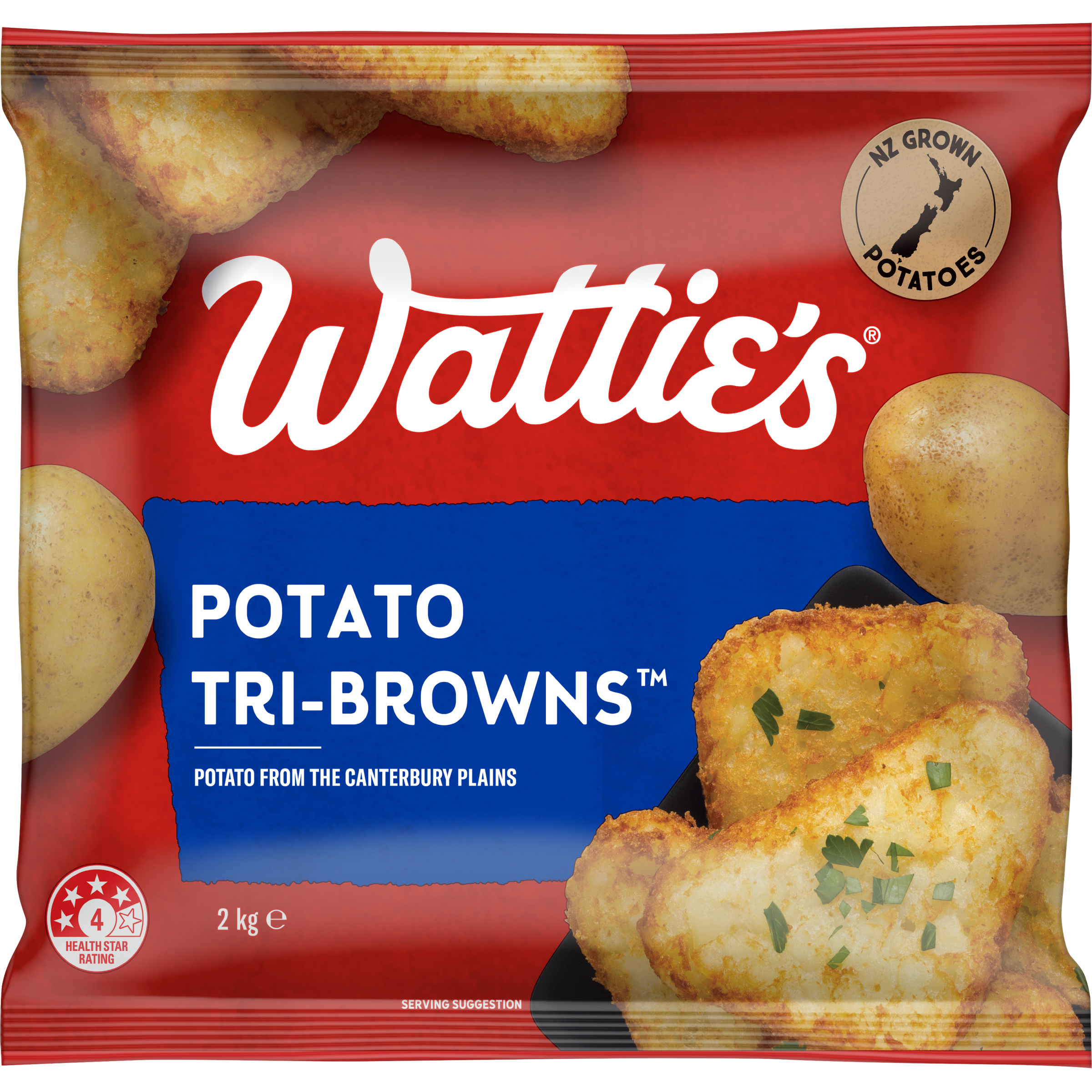 Wattie's® Potato Tri-Browns™ are a delicious side dish for dinner or breakfast. Cook in the oven, pan or deep fry and serve with a selection of toast, eggs and roasted vegetables. Made from shredded potato which is par-fried in canola oil then frozen, Wattie's® Potato Tri-Browns™ are a convenient, time-saving option to add to your meal. These tri-browns contain no added colours or flavours, and or preservatives. Packed in a 2 kg bag, Wattie's® Potato Tri-Browns™ are a freezer essential. • Breakfast essential • Quick and easy to prepare • Ideal for as a side to your meal • Low in saturated fat • No Preservatives