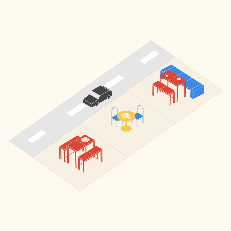Sur le trottoir ou au bord de la route? Ajoutez des tables rondes pour deux et une rangée de tables rectangulaires pour quatre derrière elles. Cela vous permettra de tirer le meilleur profit de la longueur de votre espace lorsqu’il est limité par la largeur.
