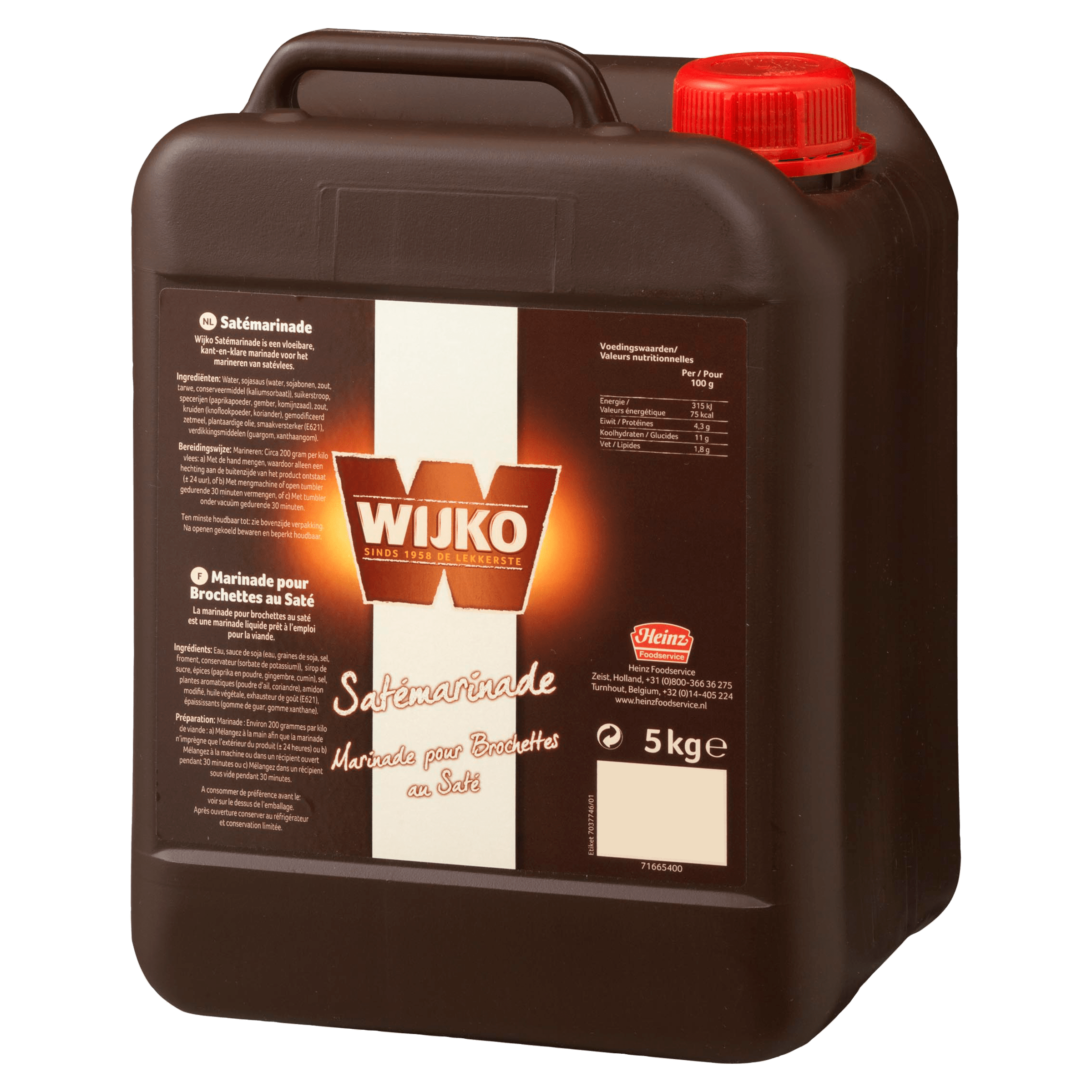 Wijko satémarinade is de marinade voor het marineren van saté of andere vleesgerechten. Het is en kant-en-klare marinade dus u heeft zo een heerlijke marinade. Verpakt per can van 5 kilo.
