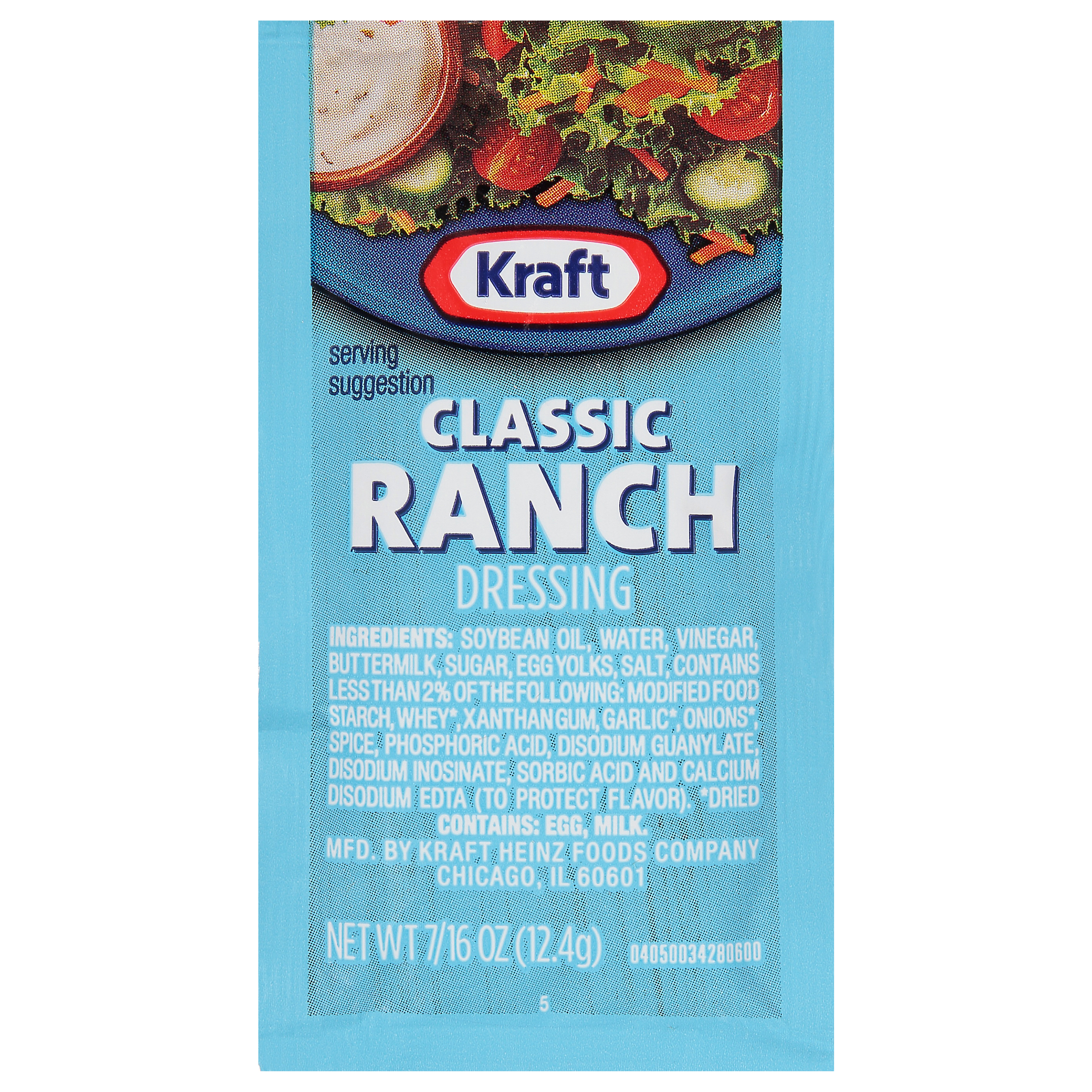 Kraft Ranch Salad Dressing single-serve packets (200 per case) are ideal for use in concessions, restaurants, cafeterias, commercial kitchens, delivery and takeout food service. Our dressings offer distinctive and balanced flavor, a consistently fresh and vibrant appearance, superior cling and a thick, rich texture. Along with being a delicious addition to vegetable salads, our ranch dressing is a great topping for sandwiches, burgers and grilled meat, and makes a tasty dipping sauce for chicken nuggets, fries, veggies and much more. Packaged in small, single-serving portions, Kraft dressing packets are a smart way to control costs while providing convenience to consumers. At home and away from home, consumers know and love the great taste of Kraft.