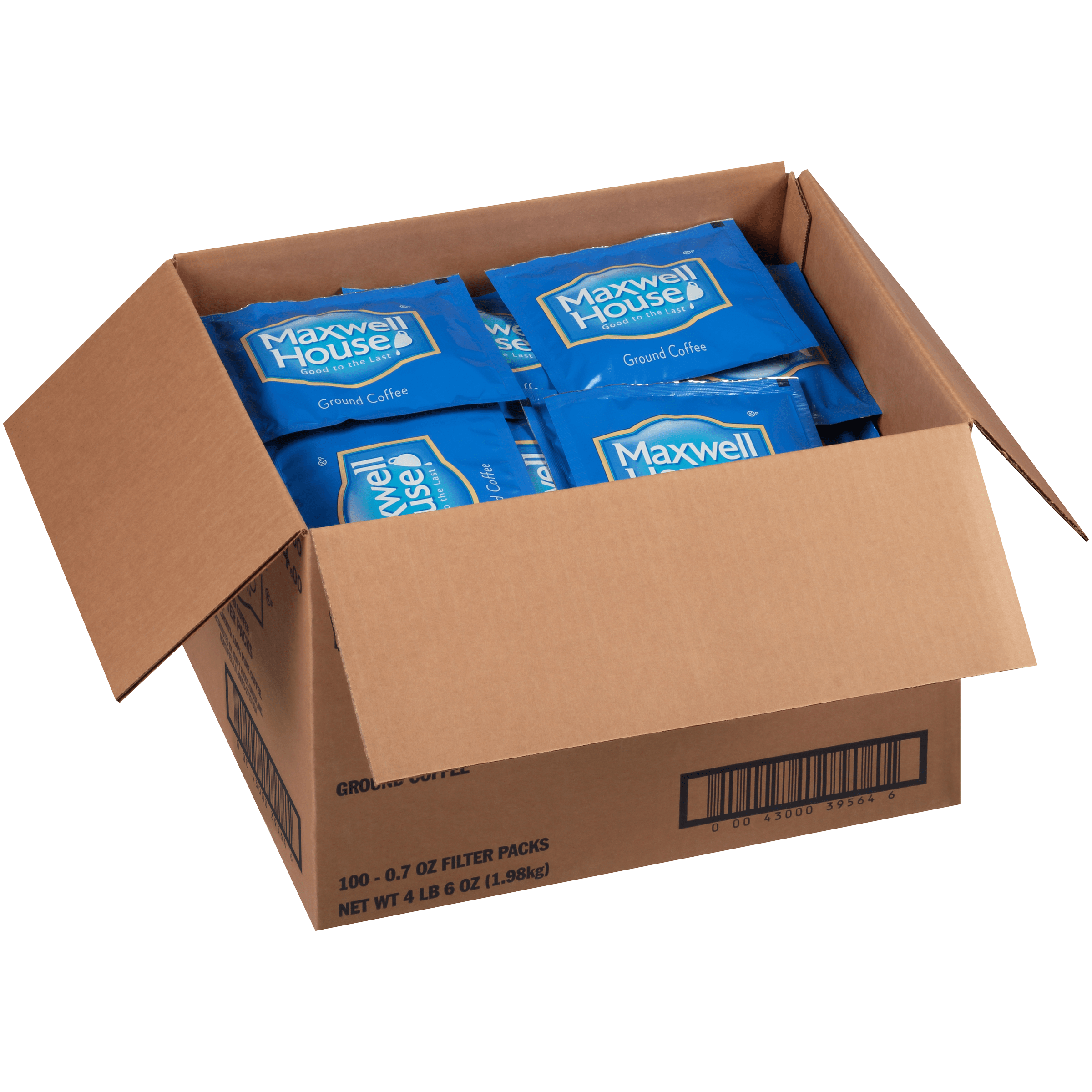 Maxwell House Ground Coffee Filter Packs, 0.7 oz. packets (100 per case) are ideal for self-serve coffee stations. Whether supplied at diners, restaurants, hotels, lobbies or break rooms, Maxwell House coffee has the perfect balance of strength and flavor. Trusted by generations of coffee drinkers, our medium roast ground coffee has mild acidity and body for a well-rounded, consistent flavor that’s good to the last drop. Each one of our ready-to-brew 0.7 oz. filter packs is specially blended with rich, premium-quality beans, making them the ideal coffee choice in the morning or anytime. For no-mess preparation, simply place the round filter pack in the coffee maker tray, add water and brew to make the perfect 4-cup pot of coffee. At home and away from home, consumers know and love the great taste of Maxwell House.