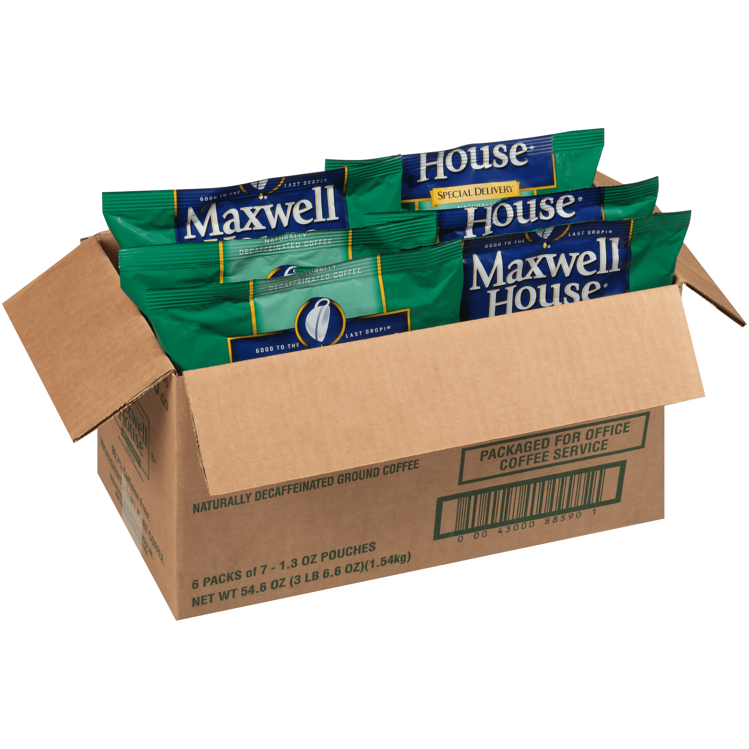Maxwell House Special Delivery Ground Decaffeinated Coffee, 1.3 oz. Filter Packets, (42 per box) are the perfect choice for your guests. Our decaf coffee packets feature a delicious taste that will provide your patrons with a quality cup that is 99.7 percent caffeine-free. Each box of our bulk size Maxwell House decaf coffee contains 42 filter packets. Our 1.3 oz. packets are ideal for fast-paced and self-serve coffee stations. Whether supplied at offices, lobbies, hotels or restaurants, Maxwell House coffee has the perfect balance of strength and flavor for a classic, rich taste. Trusted by generations of coffee drinkers, our coffee has a consistently great taste that’s good to the last drop. Our decaf coffee is specially blended with rich, premium-quality beans, making it the perfect choice in the morning or any time of day. Our large supply of flavorful decaf coffee packets makes it simple to serve your customers quickly and effectively. At home and away from home, consumers know and love the great taste of Maxwell House.