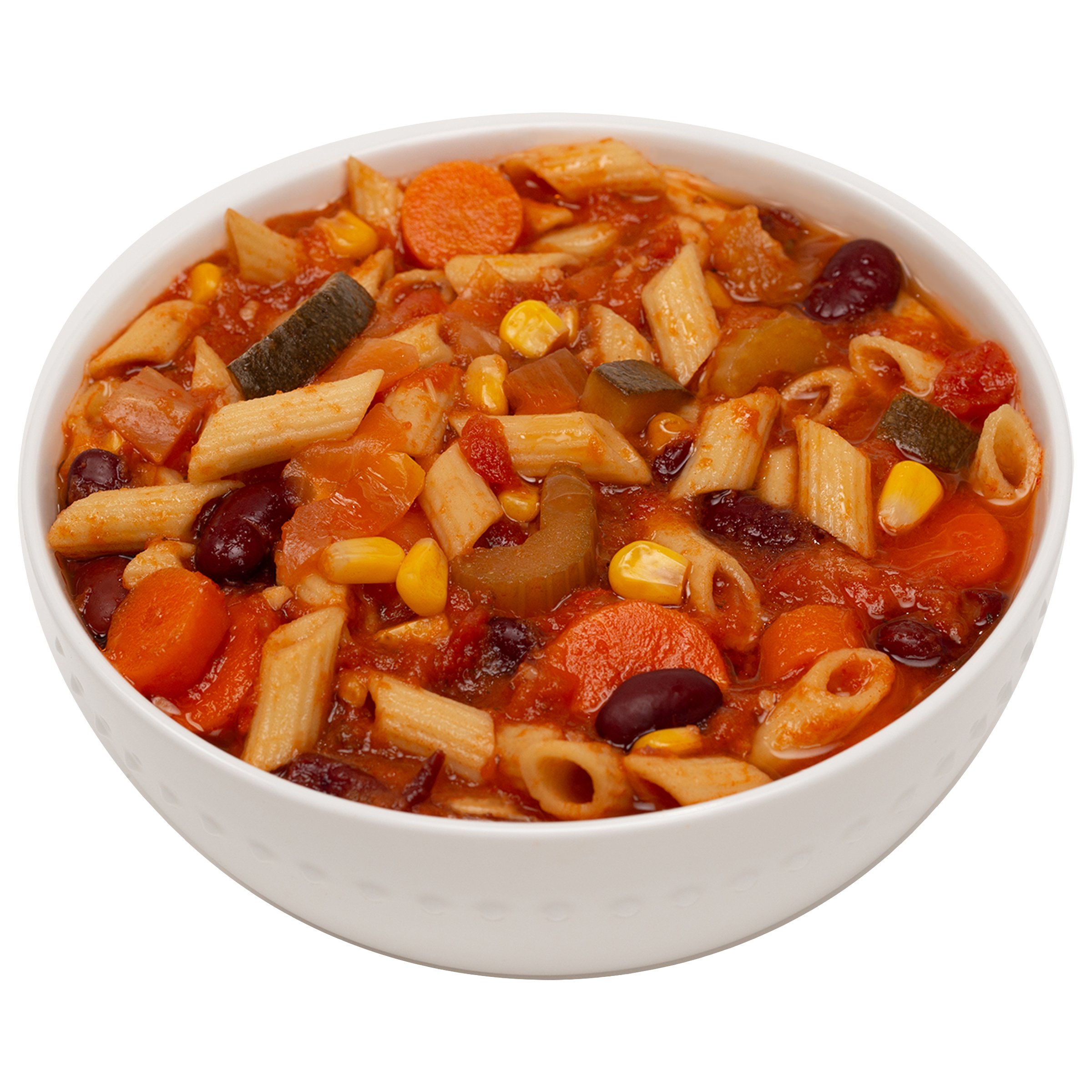 Onions, carrots, tomatoes, zucchini, sweet corn, cabbage and pasta simmered in a hearty herbed vegetarian broth.