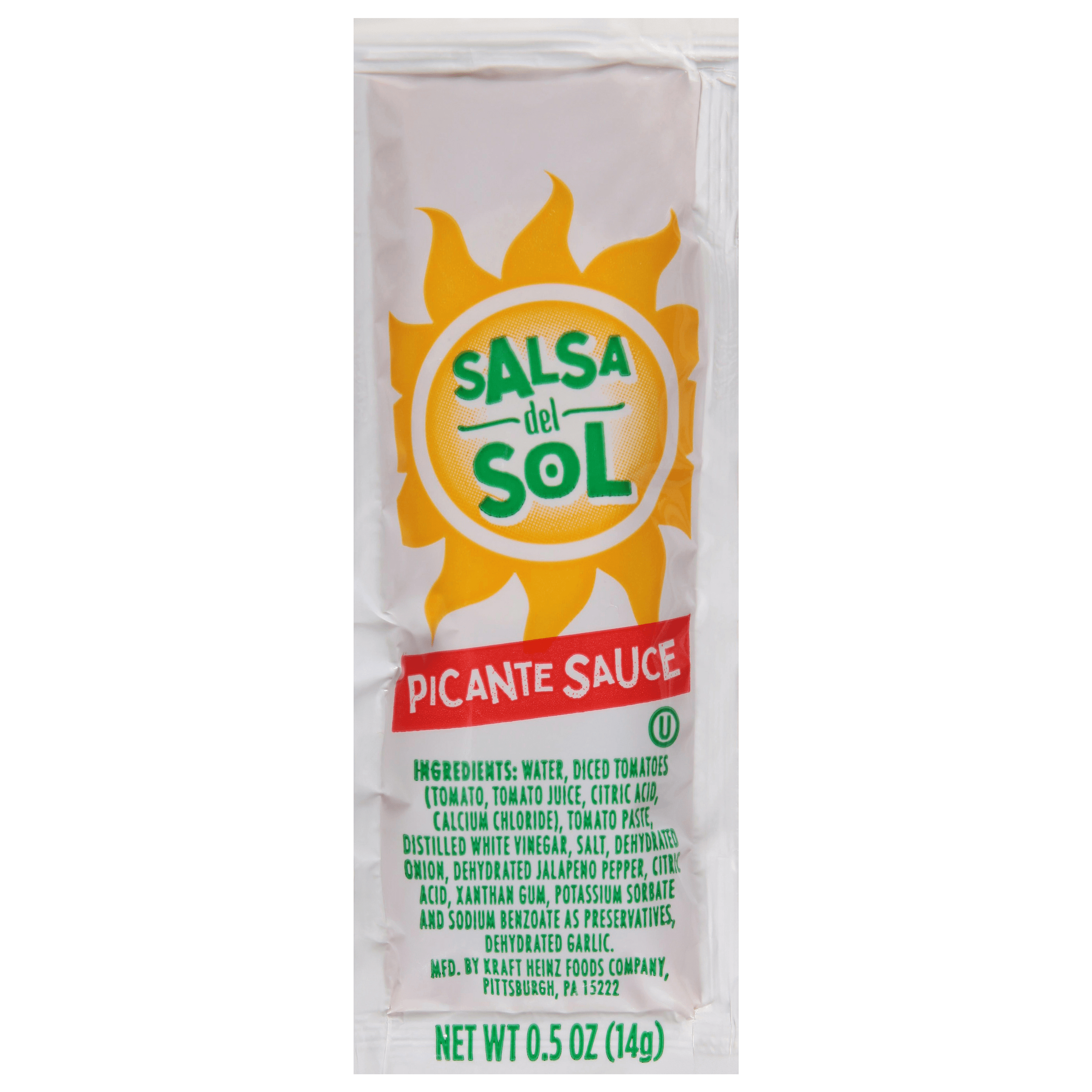 Salsa Del Sol Picante Sauce Single Serve 0.5 oz. Packets are a convenient solution for restaurants, food trucks, concessions, cafeterias, commercial kitchens and more. Salsa del Sol delivers a bold, authentic flavor with the perfect amount of heat to satisfy any craving. Hearty chunks of tomato, onion, garlic and spicy hot pepper will keep your guests coming back for more. Serve with tacos, burritos, nachos or squeeze it on a hamburger for a zesty kick. Perfect for takeout, delivery, self-serve condiment bars and more, patrons will appreciate the convenience of our single serve salsa packets.