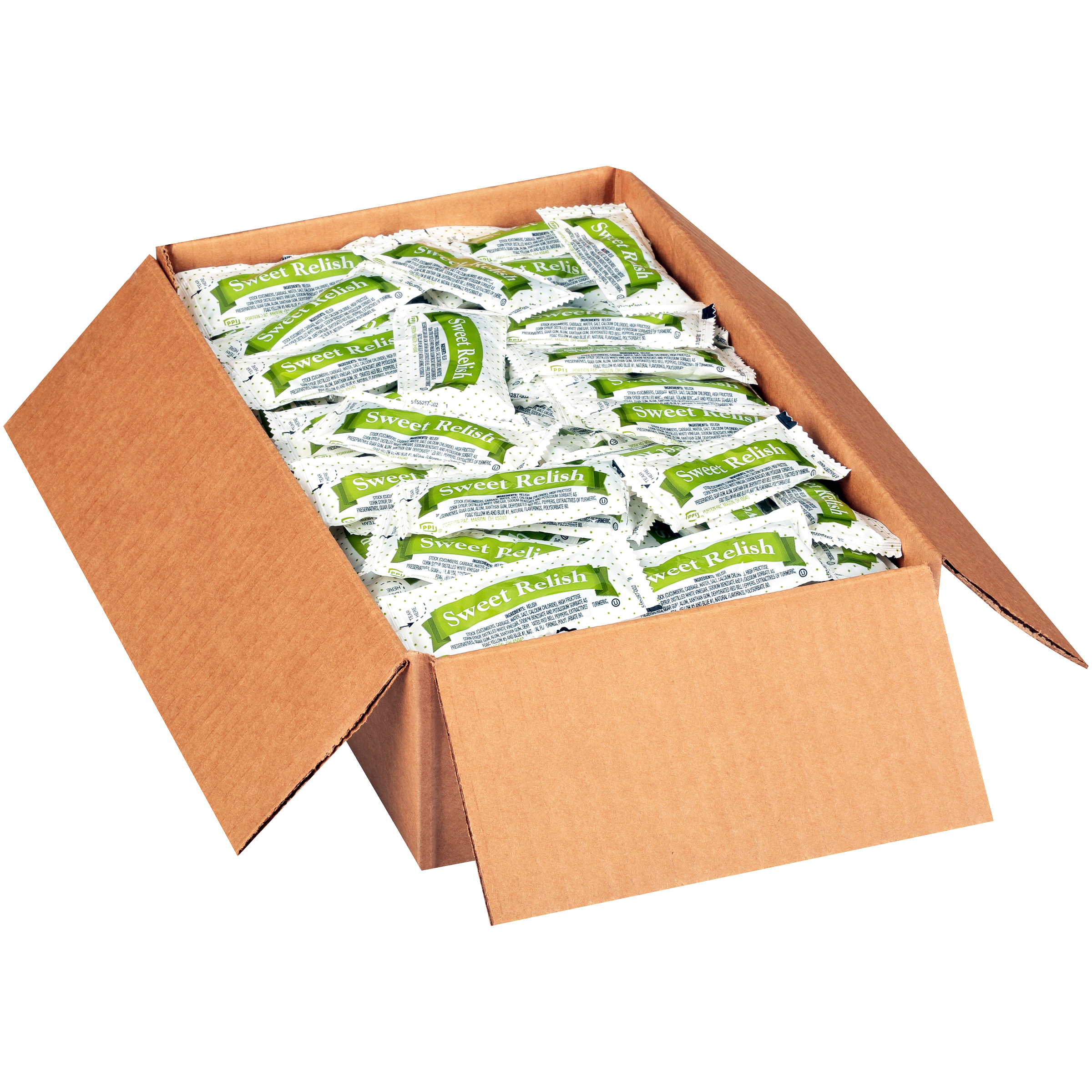 Sweet with a bold, tangy twist, PPI Sweet Relish Single Serve 9 gm. Packets (200 per case) offer convenience and versatility for foodservice. Made simply, our pickle relish combines crunchy, chopped cucumbers brined in vinegar with spices and flavorful bits of red bell pepper. A classic, essential topping for grilled favorites such as hot dogs, brats and burgers, our relish packets can also be used to dress up sandwiches or add a bit of zesty flavor to an entree or appetizer. A great option for takeout, delivery or self-serve stations in restaurants, PPI condiment packets are a no-fuss option patrons appreciate. Make grill recipes shine with the delicious addition of relish!