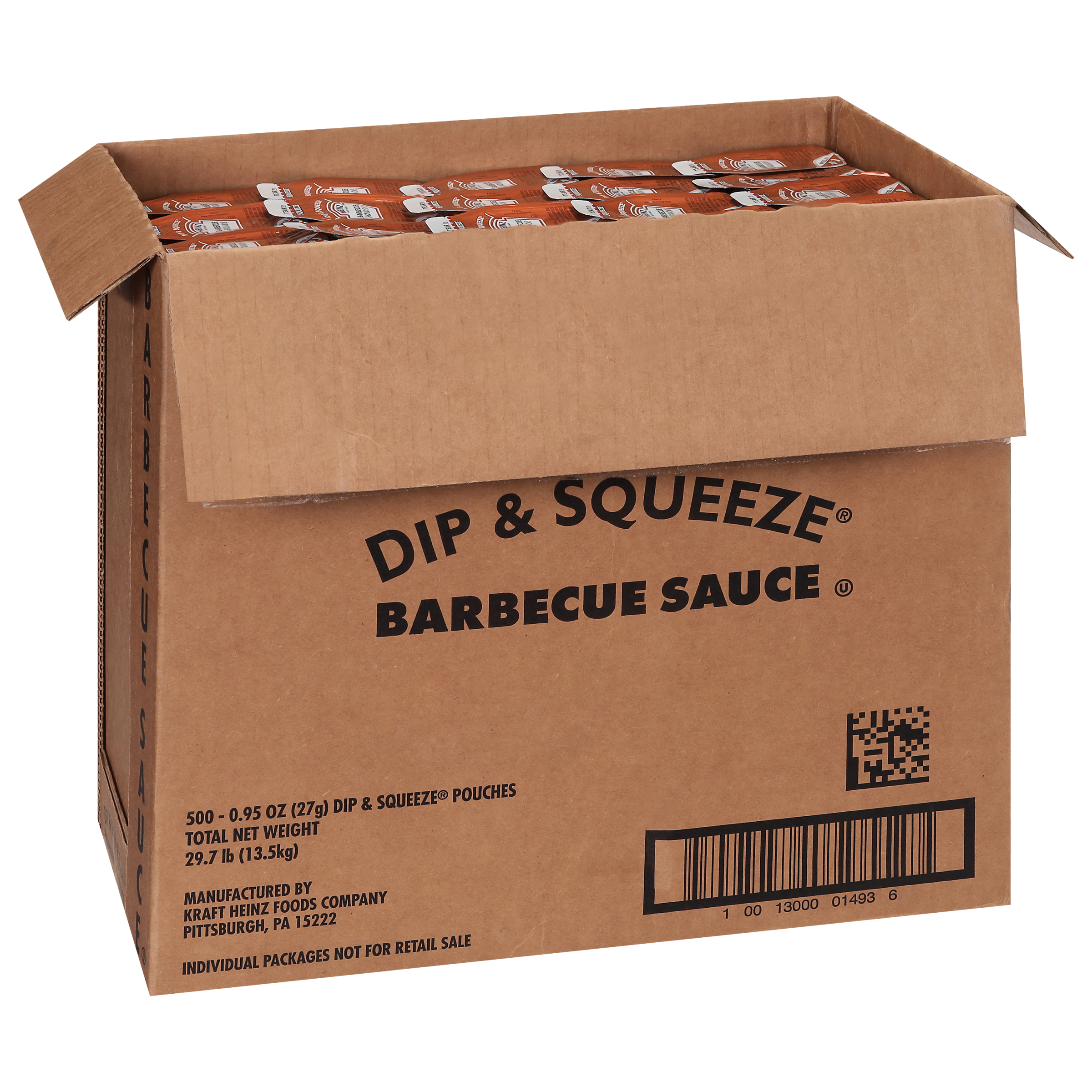 Introducing HEINZ Barbecue Sauce now offered in HEINZ's signature Dip & Squeeze packets (27 grams each, pack of 500). Tear away one end to squeeze HEINZ's delicious Barbecue Sauce as a topping, or peel away the other end to create a dunking container. These individual Dip & Squeeze packets of HEINZ Barbecue Sauce make delivery and takeout service easy and convenient. Made from sweet tomato sauce with a unique blend of spices, molasses, and natural smoke flavor, Heinz Barbecue Sauce Dip & Squeeze packets are perfect for dipping chicken fingers, wings, fries, and grilled meats or topping sandwiches, or burgers. Made with quality ingredients, Heinz Barbecue Sauce features a mouthwatering blend of sweet and smoky deliciousness that your guests will appreciate. At home and away from home, consumers know and love the great taste of Heinz.