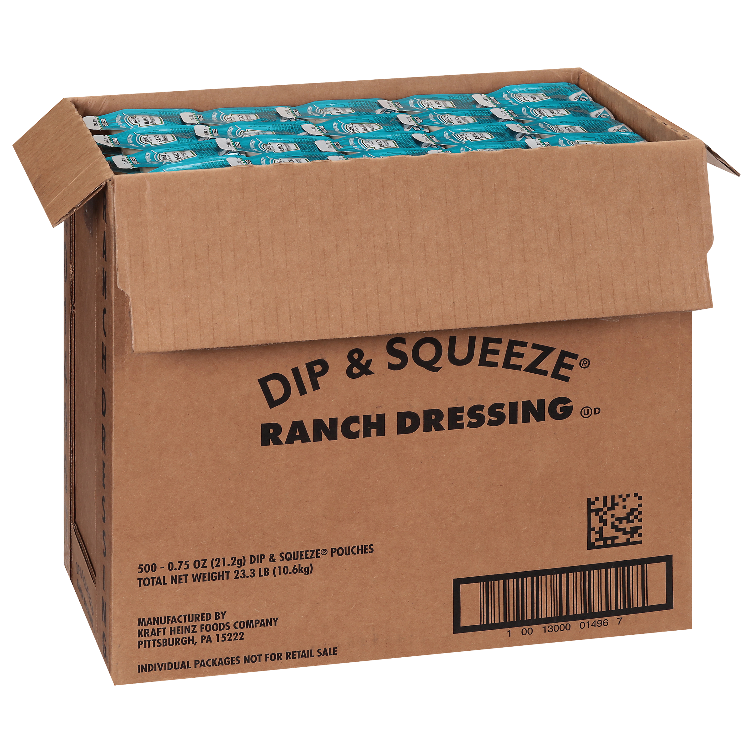 Introducing HEINZ Ranch now offered in HEINZ's signature Dip & Squeeze packets (21.2 grams each, pack of 500). Tear away one end to squeeze HEINZ's delicious Ranch as a topping, or peel away the top to create a dunking container. These individual Dip & Squeeze packets of HEINZ Ranch make delivery and takeout service easy and convenient. With a robust, classic flavor, Heinz Ranch adds a creamy, delicious kick to your favorite foods. Heinz Ranch Dip & Squeeze packets are perfect for dipping chicken fingers, wings, fries, and veggies or topping salads, sandwiches, or burgers. At home and away from home, consumers know and love the great taste of Heinz.