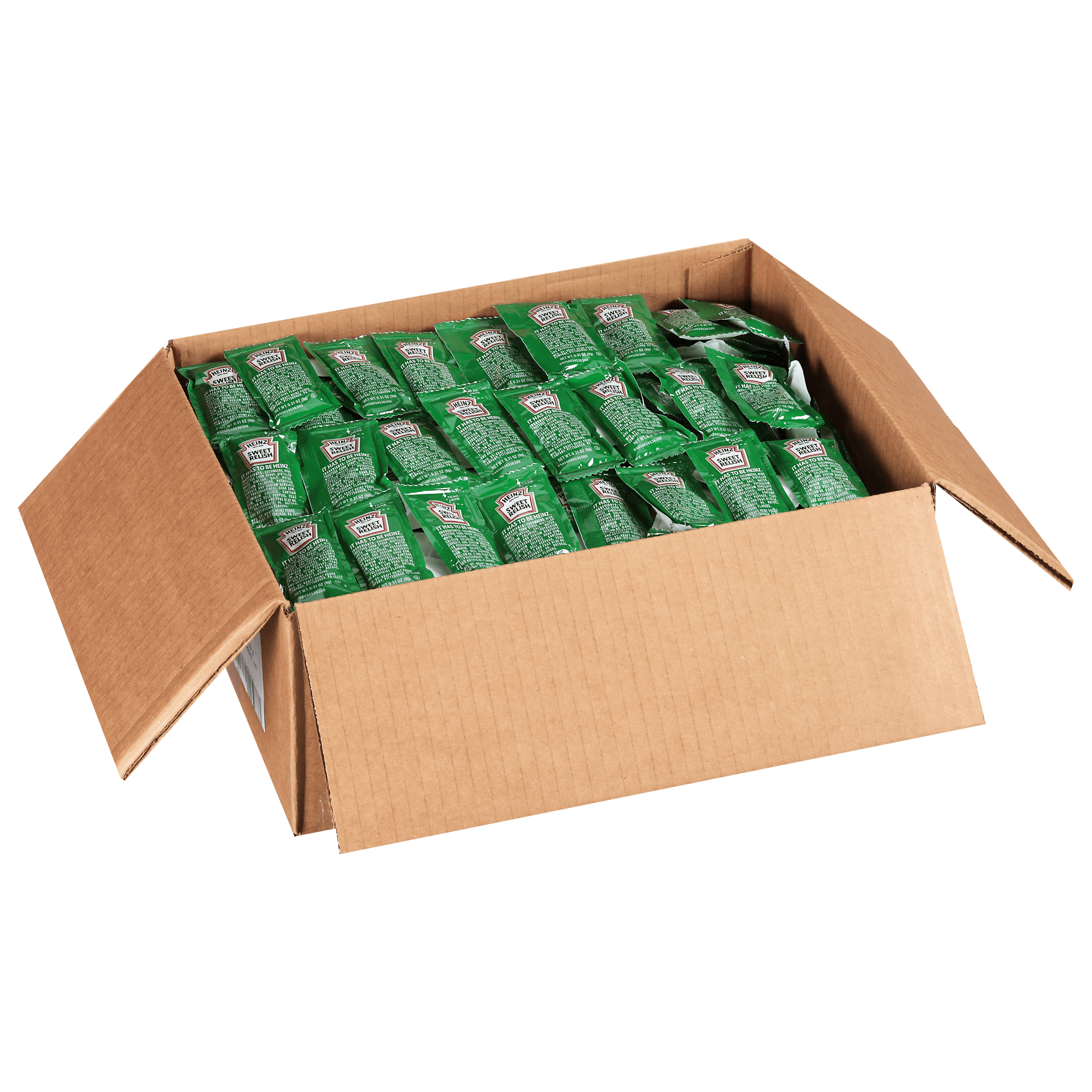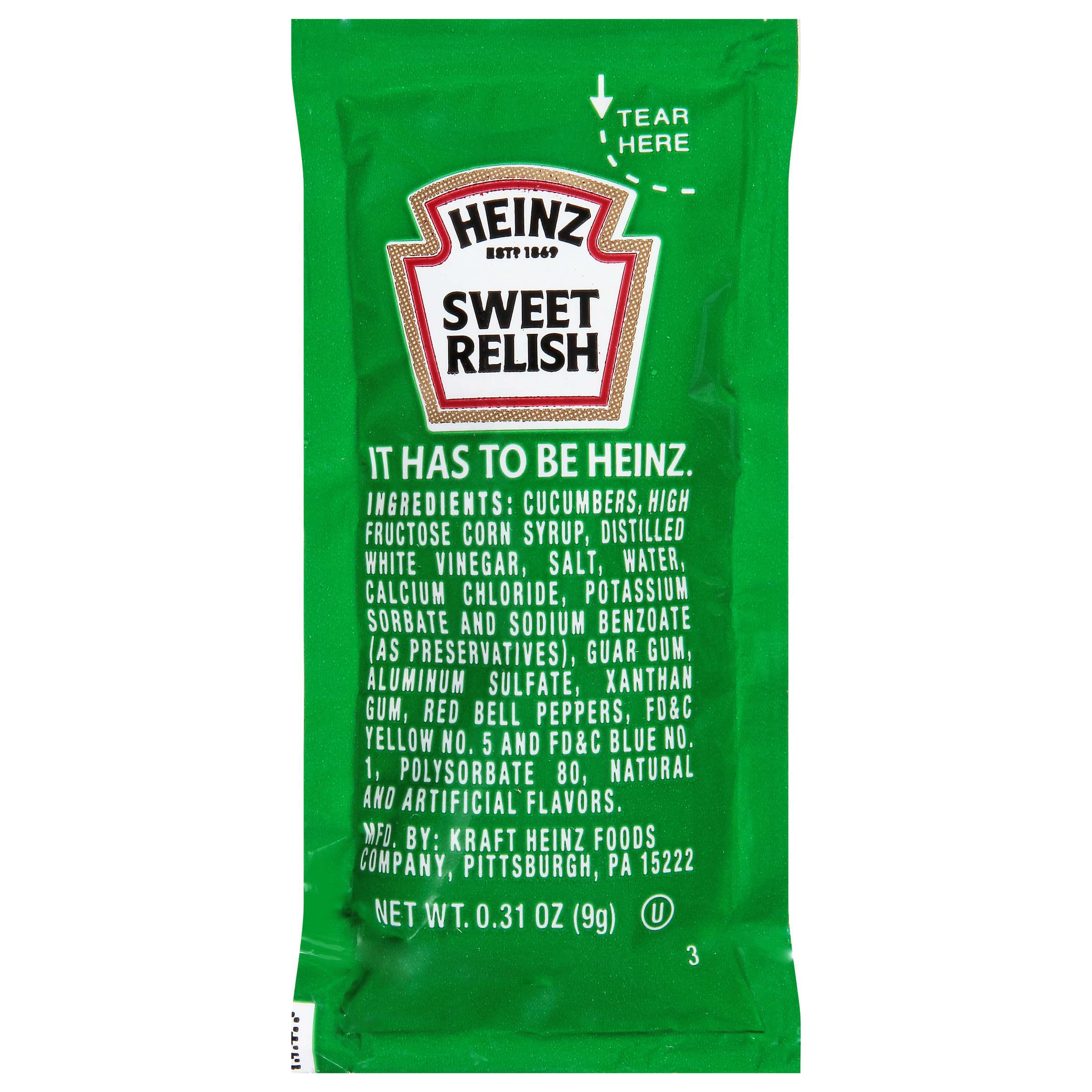 Heinz Sweet Relish single serve 0.31 oz. packets (200 per case) are a convenient choice for restaurants, cafeterias, fast food, takeout, concessions and more. Made with a bright, flavorful blend of sweet pickled cucumbers, white vinegar and a variety of natural flavors and spices, our relish adds a zesty flavor that customers love. Perfect for pairing with grilled items such as hamburgers, hot dogs, brats and more, Heinz single serve packets make takeout and delivery condiment service simple. At home and away from home, consumers know and love the great taste of Heinz.