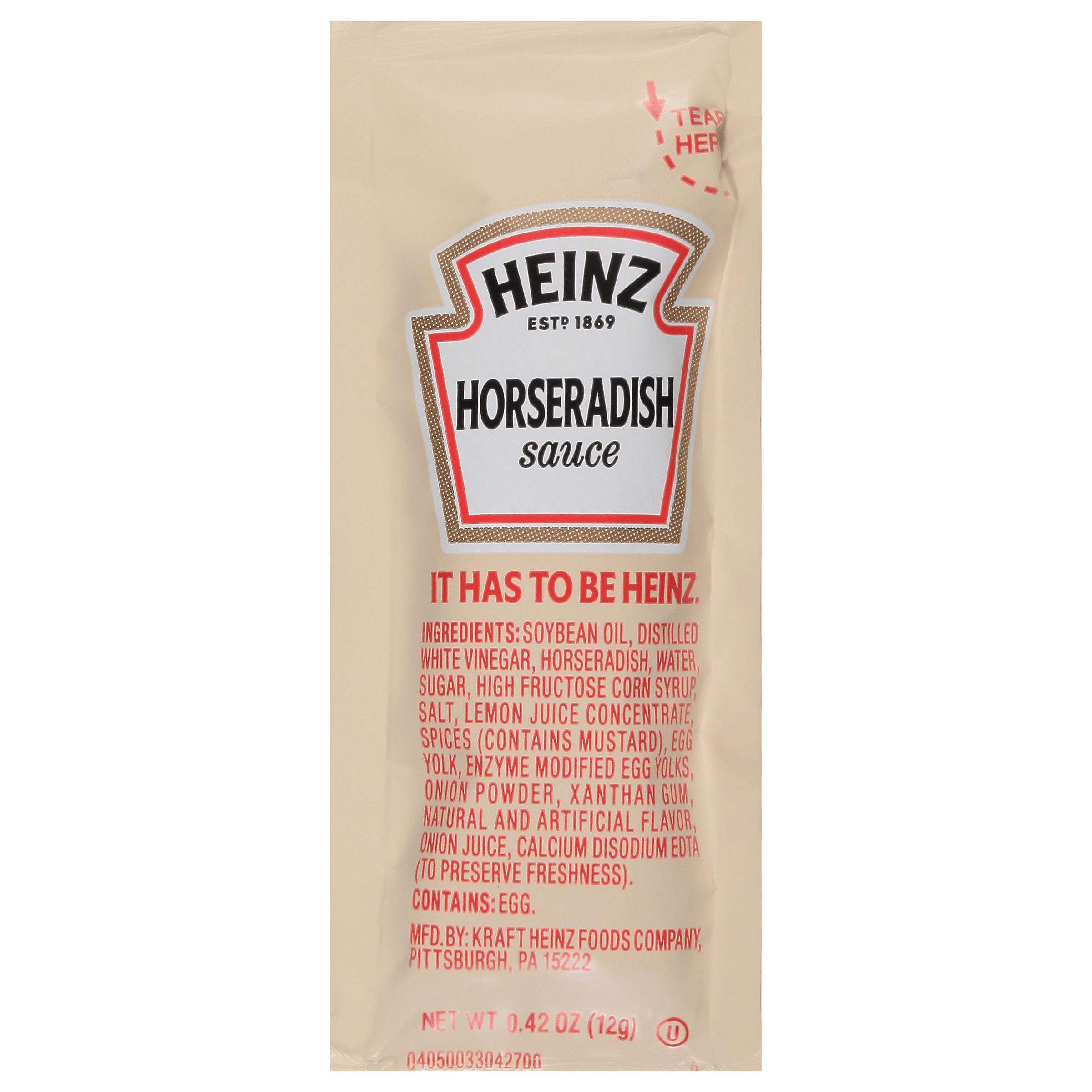 Heinz Horseradish Sauce single serve 12 gm. packets (200 per case) offer simple convenience for commercial kitchens, restaurants, concessions, food trucks and more. Made with a creamy, zesty blend of horseradish, egg yolk, lemon juice, vinegar and flavorful spices, this signature condiment adds rich, bold taste to your patrons' favorite meals. Our single serve packets are ideal for offering with iconic dishes such as prime rib, steak and roast beef, or served as a dynamic dipping sauce or sandwich topping. Whether your customers are dining in or picking up a to-go order, our sauce packets make it simple for them to customize the flavor profile of their own meal. At home and away from home, consumers know and love the great taste of Heinz.