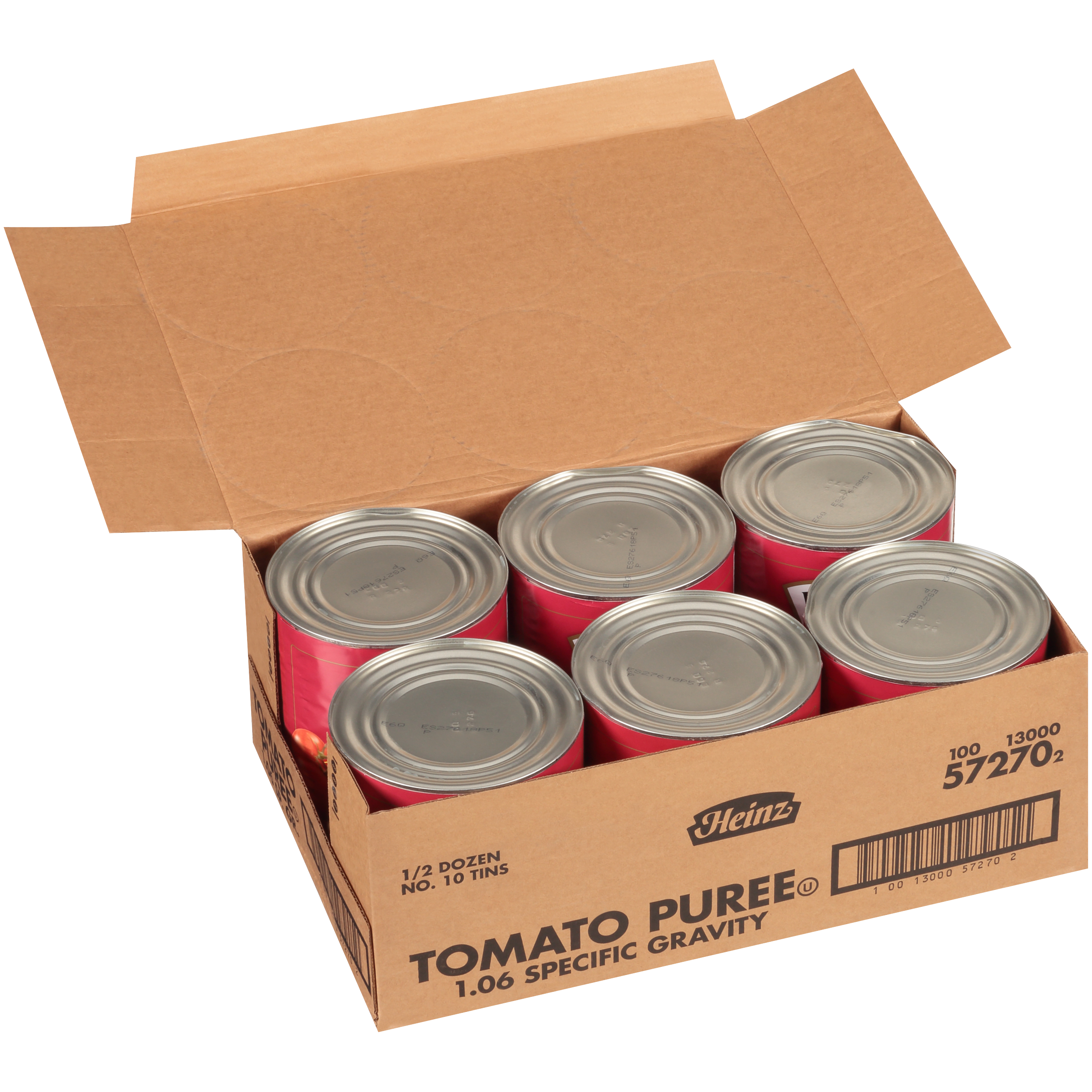 A versatile ingredient for restaurants, Heinz Tomato Puree is packaged in 106 oz. cans (6 per case) for extended shelf life and use in large volume recipes. Ideal for commercial kitchens, restaurants, cafeterias and more, our bulk product is a crowd-pleaser that guests of all ages will love. Made with vine-ripened California tomatoes, our tomato puree is ready-to-use straight out of the can. Perfect as a base for pasta, soup, sauces and more, it features a vibrant red color, smooth consistency and fresh taste. At home and away from home, consumers know and love the great taste of Heinz.
