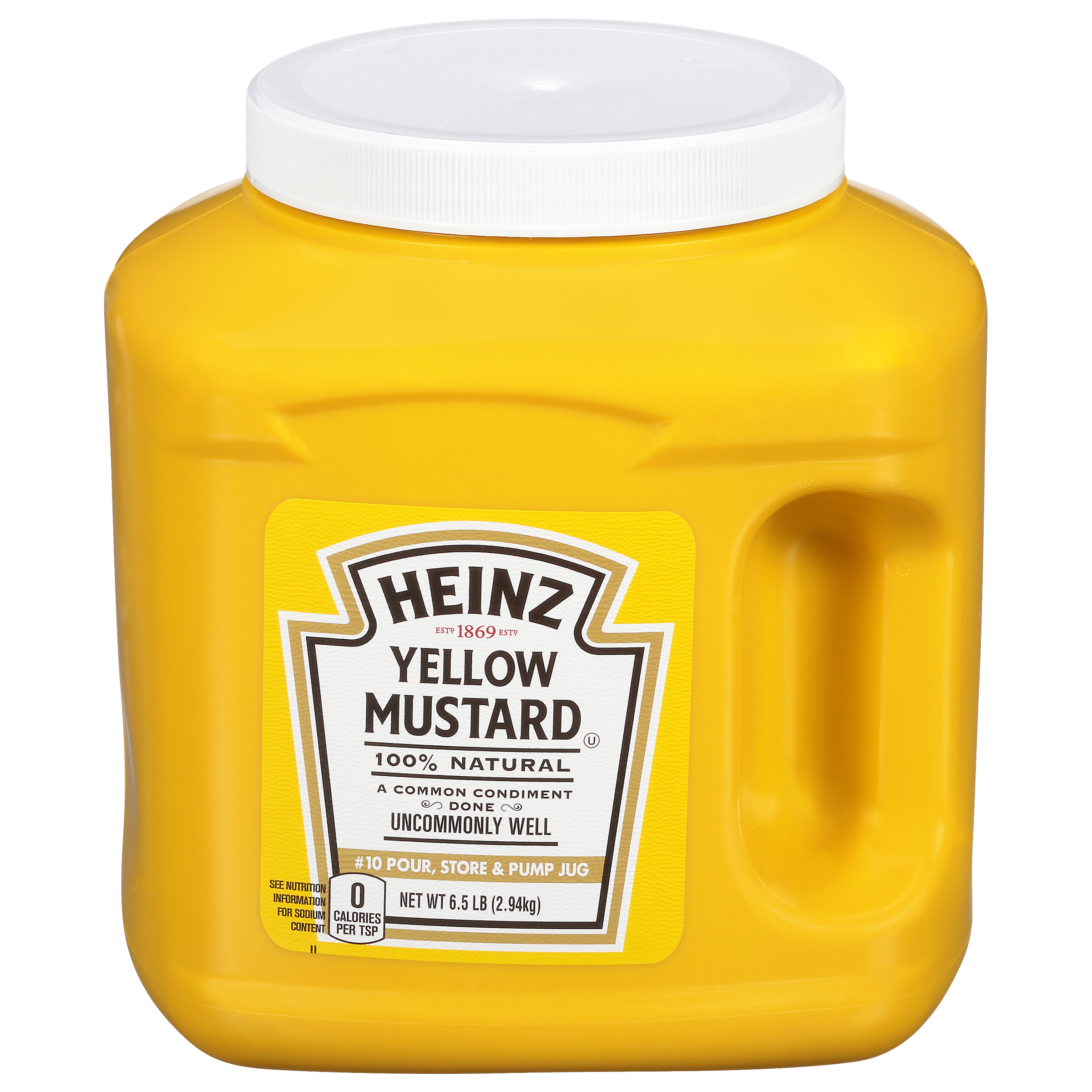 Heinz Yellow Mustard offers the trusted, flavorful taste of classic Heinz Mustard that complements a wide range of foods. Try our yellow mustard on burgers, hot dogs, chicken tenders, fries, pretzels or sub sandwiches. Our versatile mustard is more than a delicious condiment. It's also great as a marinade and glaze, or an ingredient in recipes like potato salad, egg salad and deviled eggs. Made with #1 grade mustard seeds, our yellow mustard delivers the classic taste you know and love. Our delicious prepared yellow mustard will elevate any meal you add it to, and will surely be a hit with the entire family. The 6.5-pound jug is ideal for easy scooping or pump dispensing (pump sold separately). Stock up with our bulk 6 pack of mustard. Whatever the occasion, Heinz Yellow Mustard is something the whole family will love.