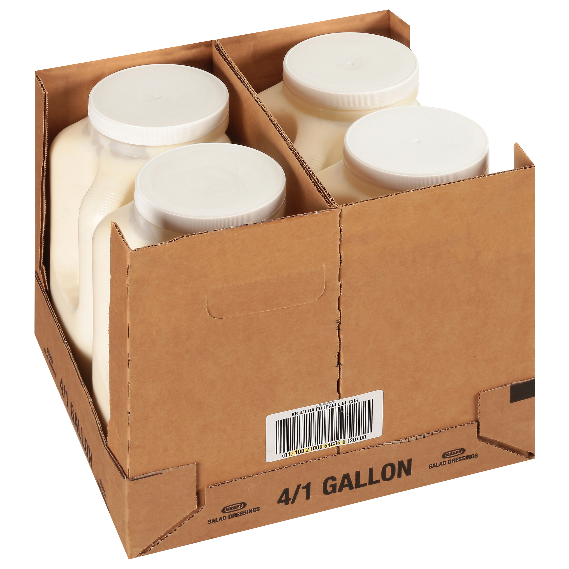 Kraft Blue Cheese Dressing uses quality ingredients for a delicious, classic taste that shakes up your salads. A sweet and tangy flavor teams up with blue cheese to create a zesty, full-bodied taste with a texture you’ll love. Premixed and ready to use, our dressing offers a convenient way to enhance your meals. Use our blue cheese dressing as a dipping sauce for hot wings, a dressing for salad or as a burst of flavor in your favorite coleslaw recipe. Each of the four one gallon jugs make it easy to pour dressing without making a mess. Keep the jug refrigerated after opening.