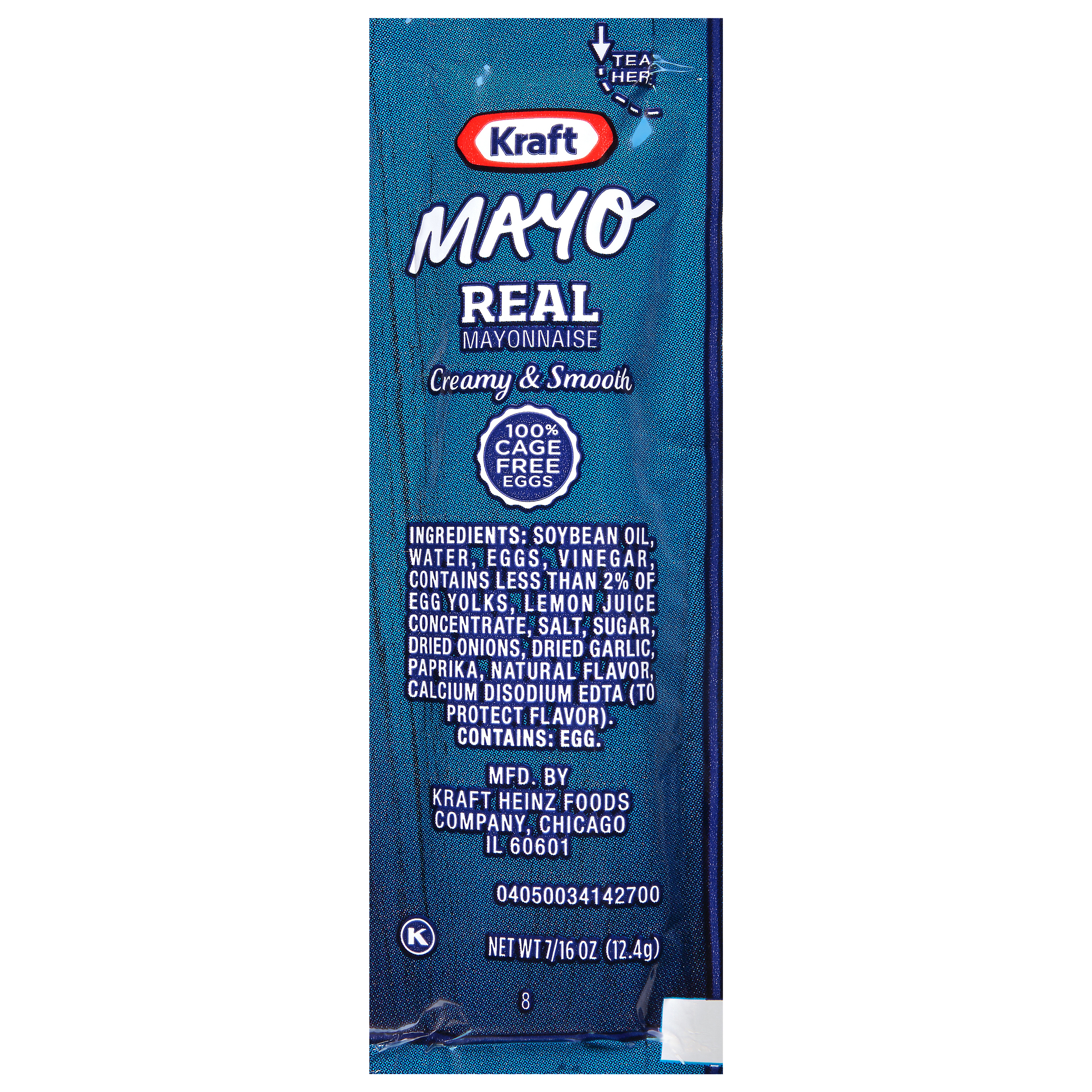 Kraft Real Mayonnaise single serve 12 gm. packets (500 per case) are a convenient solution for fast food, restaurants, concessions and more. Whether you're providing a front-of-house self-service condiment station or fulfilling delivery or takeout orders, our packets offer the signature Kraft taste that customers come back for. Made with cage free eggs and other natural ingredients, customers can use our mayo packets as a delicious sandwich topping or a creamy dipping sauce for fries, chicken nuggets and more.