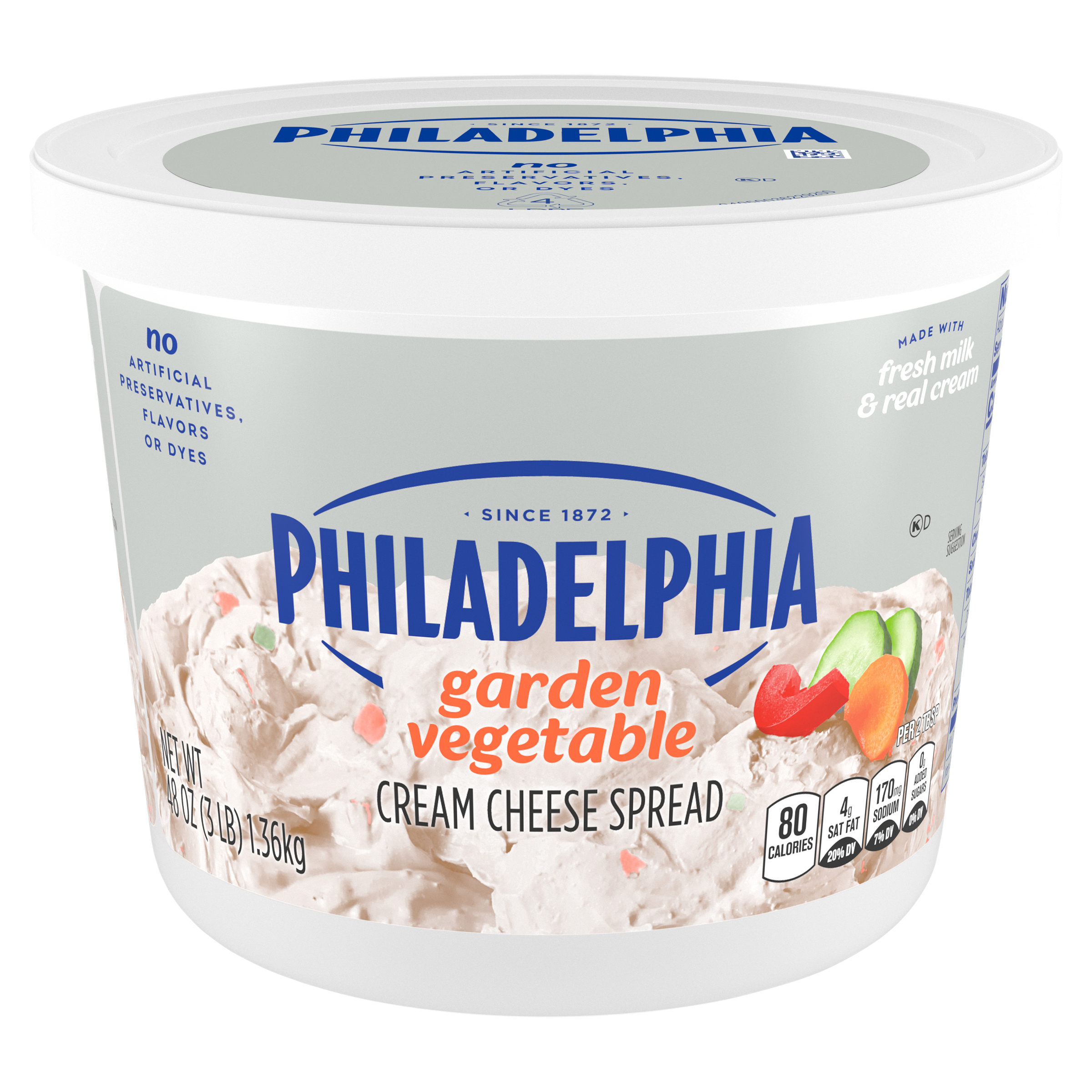 Our Philadelphia Garden Vegetable Cream Cheese Spread 48 oz. tubs (6per case) are convenient to use in commercial kitchens, restaurants, large volume recipes and more. Our garden vegetable cream cheese spread is made with onions, carrots, green and red bell peppers, cucumbers plus fresh milk and real cream. Each 3 lb. tub is ideal for prepping classic recipes and much more. Philadelphia Garden Vegetable Cream Cheese Spread has no artificial preservatives, flavors or dyes. At home and away from home, consumers know and love the great taste of Philadelphia Garden Vegetable Cream Cheese Spread.