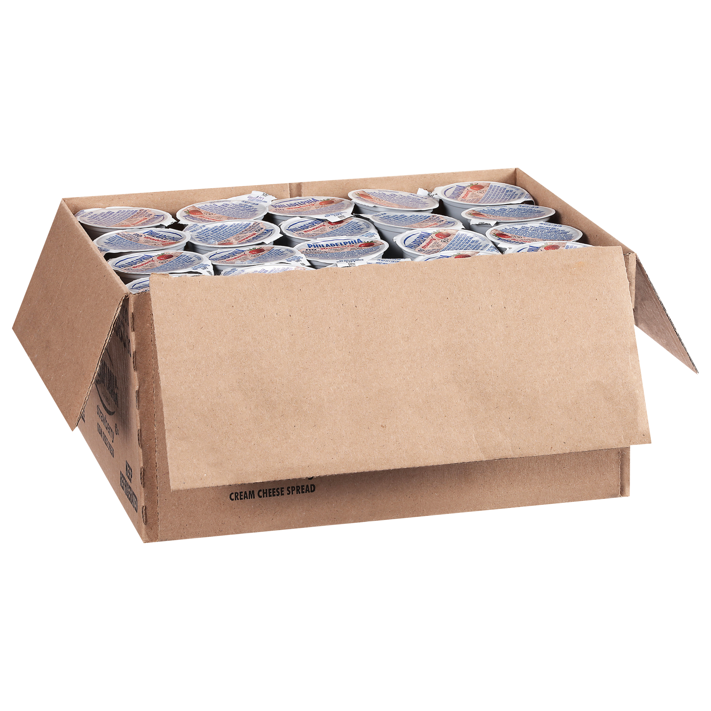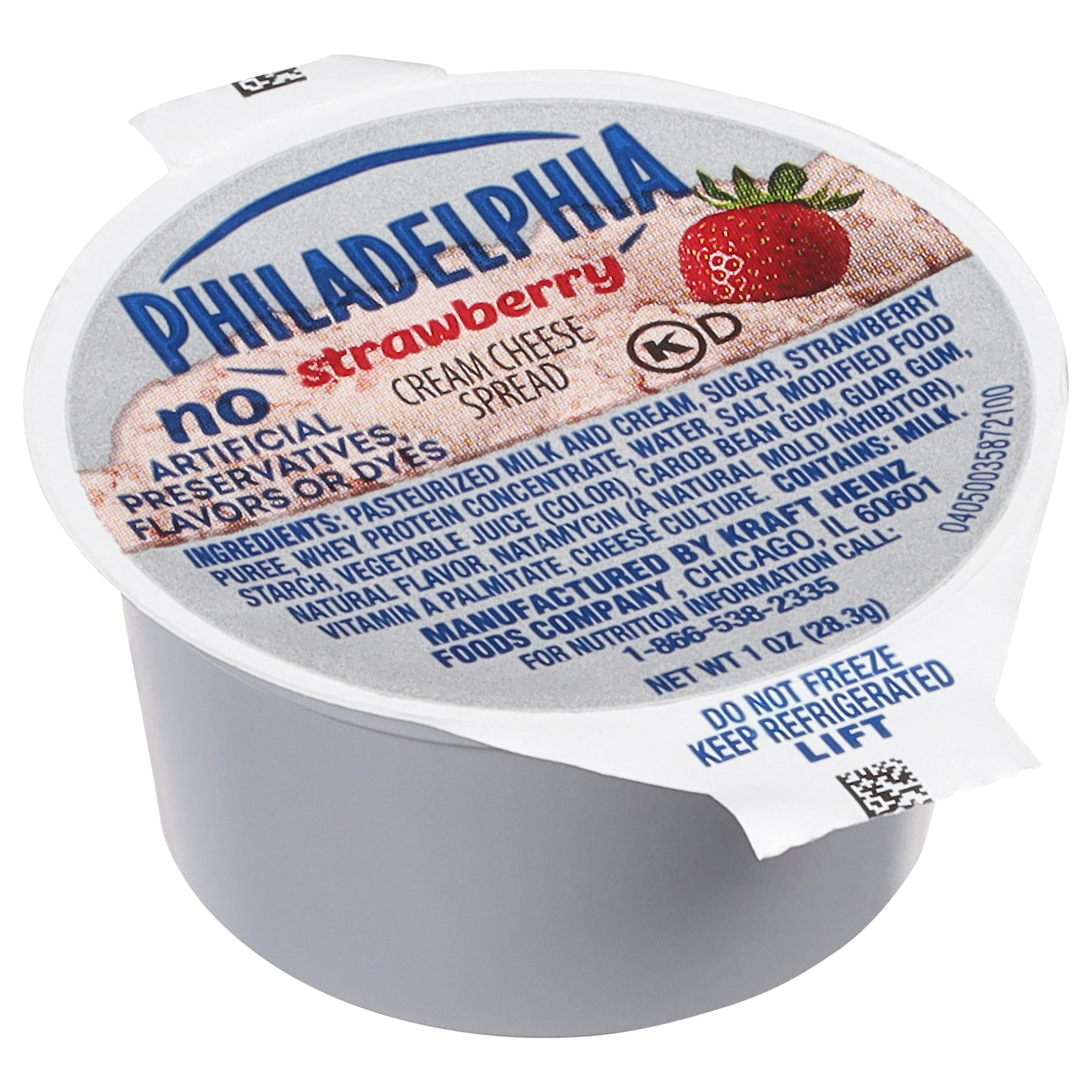 Philadelphia Strawberry Cream Cheese Spread 1 oz. cups (100 per case) are convenient for commercial kitchens, restaurants, cafeterias, concession stands, takeout, delivery and more. Our strawberry cream cheese spread is made with strawberry puree plus fresh milk and real cream. Offer these individual single-serve cream cheese cups to customers alongside a bagel, with room service, takeaway, or at a self-serve breakfast bar. Philadelphia Strawberry Cream Cheese Spread has no artificial preservatives, flavors or dyes. At home and away from home, consumers know and love the great taste of Philadelphia Strawberry Cream Cheese Spread.