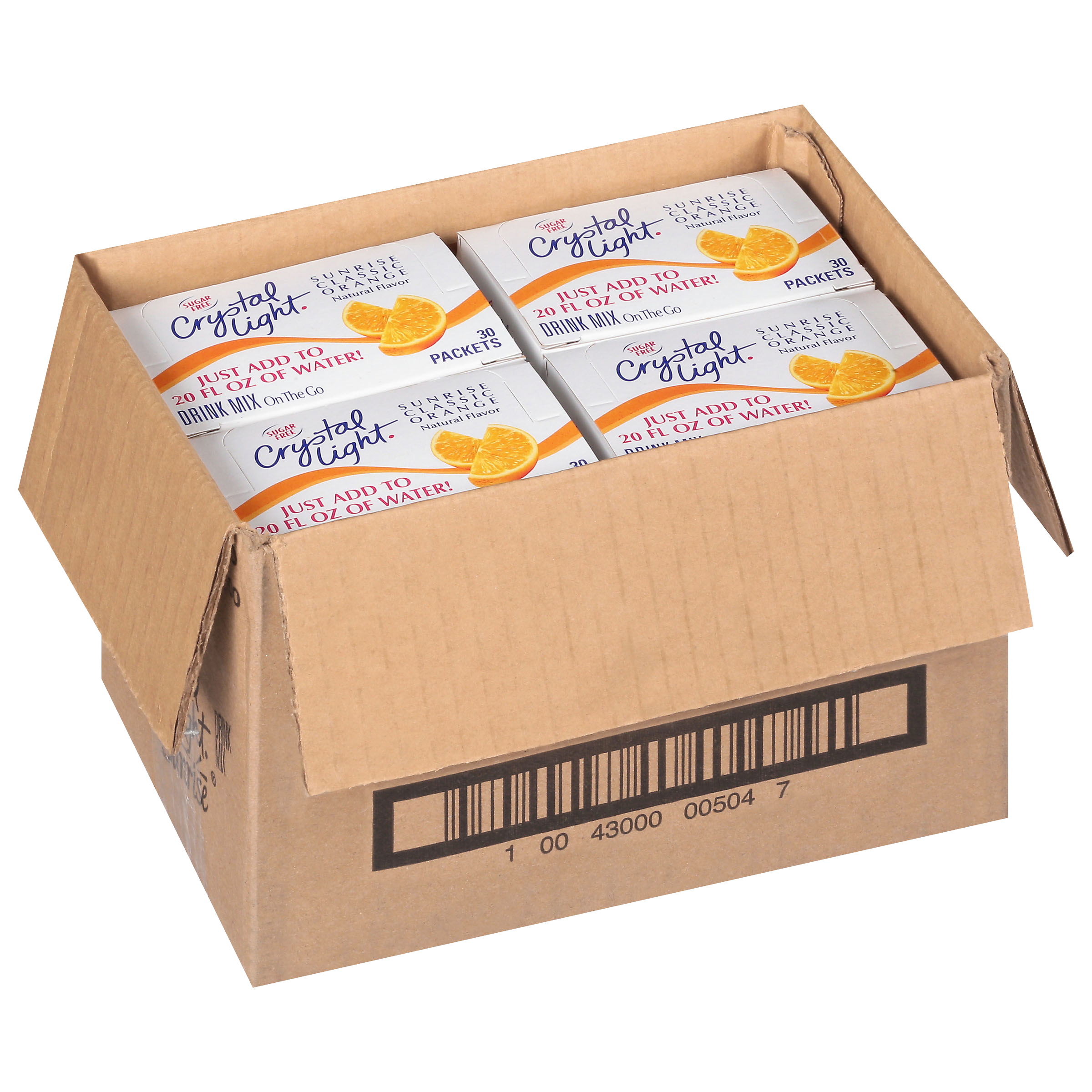 Offer patrons a burst of delicious orange flavor with Crystal Light Sunrise Orange Naturally Flavored Powdered Drink Mix. One case includes 30 individual stick packets per box, 4 boxes per case (for a total of 120 single-serve packets). Our easy-to-use orange drink mix instantly dissolves when combined with water and is excellent for quick back-of-house preparation in restaurants, concessions, commercial kitchens and more. As the #1 selling, non-carbonated sugar-free drink mix, your customers will enjoy Crystal Light's sweet, pleasantly tart citrus flavor. With zero grams of sugar and only 10 calories per serving, our orange drink mix is a sweet alternative to juice and soda, with 90 percent fewer calories than leading beverages (per 20 fl oz beverage, this product 10 calories, leading beverages 170 calories). Perfect for serving with salads, picnic food, barbecue, burgers, hot dogs and just about anything, this bulk pack of Crystal Light Sunrise Orange On-the-Go Mix is a dynamic choice for foodservice. At home and away from home, consumers know and love the great taste of Crystal Light.