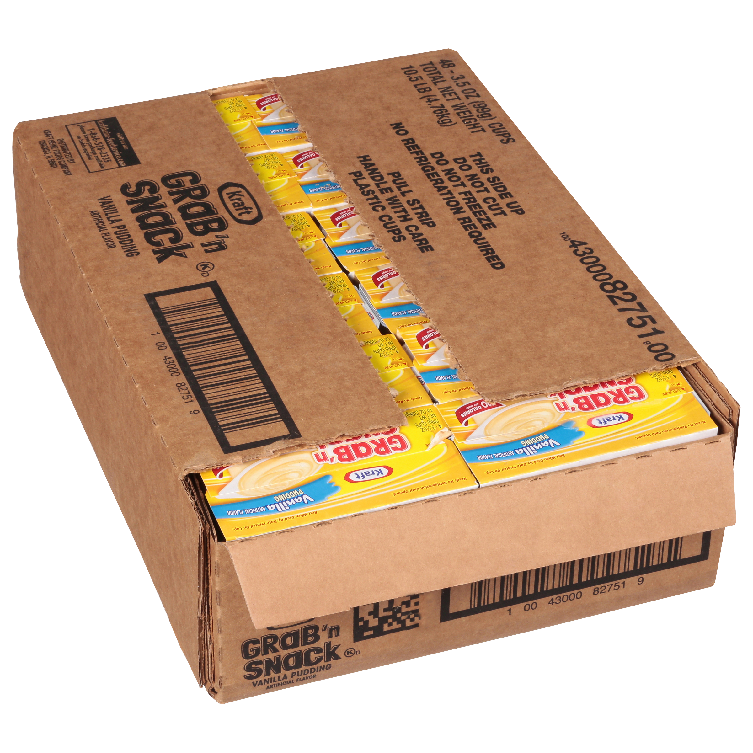Kraft Grab 'n Snack Vanilla Pudding, 3.5 oz. cups (12 packs of 4 cups per case) are a deliciously creamy dessert option that both kids and adults crave. With only 110 calories per serving, our tasty pudding snack packs are a smart choice for cafeterias, restaurants, school programs and more. Made with real milk, Kraft vanilla pudding cups deliver a sweet vanilla flavor in a perfectly creamy, spoonable dessert format. Featuring a sturdy, portable package with a peel-back lid, Kraft pudding snacks allow customers to take their dessert along with them. Perfect for on-the-go, packed into a lunchbox or bag, or to easily enjoy wherever the craving strikes. At home and away from home, consumers know and love the great taste of Kraft.