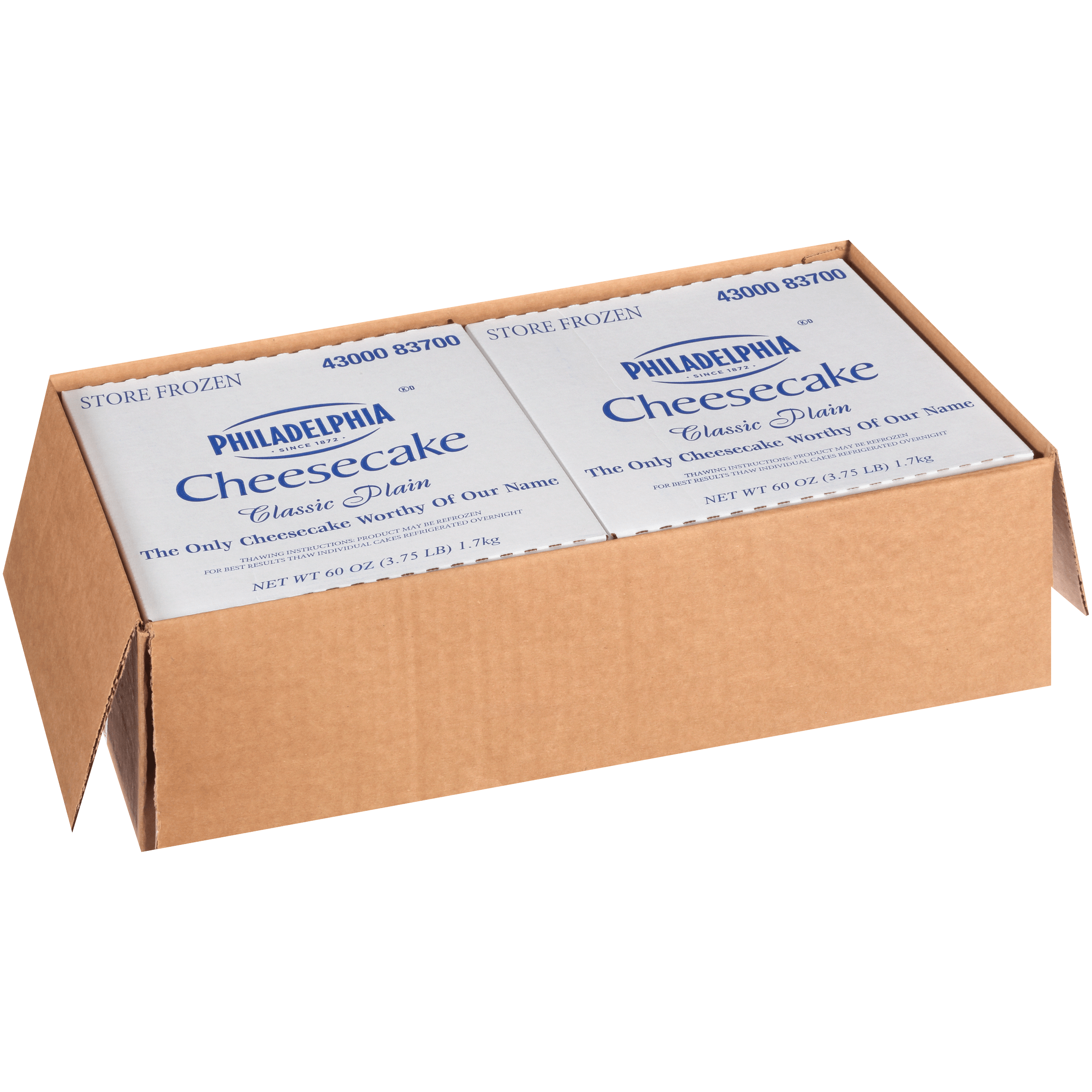 Give your guests an unforgettable dining experience with Philadelphia Plain Cheesecake. Our box pack contains a total of four 60-ounce rich, creamy pre-cut cheesecakes without a crust. Ideal for catering events, hotel dining halls, in-room dining, bistros, diners or commercial kitchens, our classic New York-style, dry baked cheesecakes feature a delicious homemade taste. Hand-greased baking pans and the use of butter ensure premium quality. Ready to serve right out of the box, our plain cheesecakes are individually wrapped, allowing for maximum freshness, product protection and control over portion size. Philadelphia Plain Cheesecake is perfect after meals or as a tasty snack alongside coffee or tea. At home and away from home, consumers know and love the great taste of Philadelphia Cheesecake.