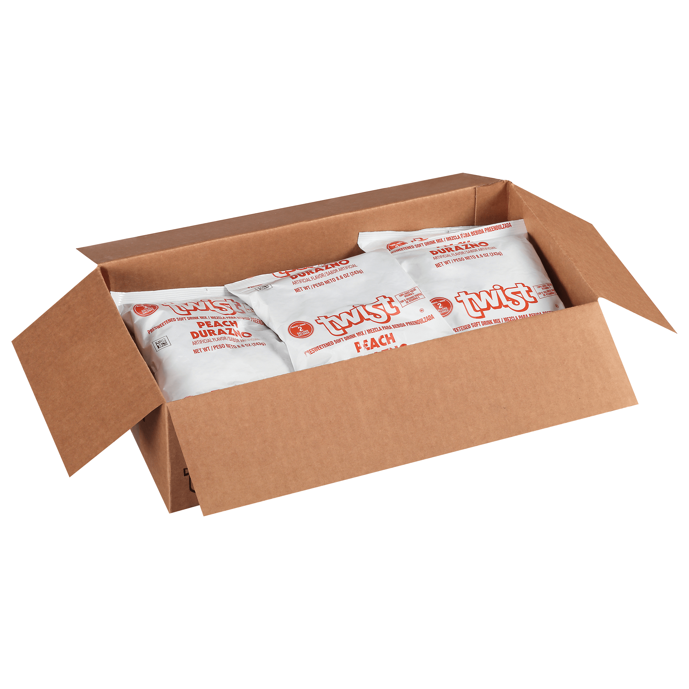 One case of Twist Peach Powdered Drink Mix includes twelve 8.6 oz. pouches. Our easy-to-use powdered mix is a great way to enjoy a delicious and sweet low-calorie peach beverage. Fortified with 100% Daily Value Vitamin C, Twist Peach is a refreshing alternative to sodas that kids and adults are sure to love. Our bulk packaging minimizes waste and makes this product perfect for restaurants, commercial kitchens, food trucks, cafeterias and more. Convenient pouches make this product easy to store and serve in any fast-paced foodservice setting. Twist Peach provides a sweet, summery peach flavor with only 30 calories per 8 oz. serving. Use for traditional beverages or to give your recipes an extra touch of crisp peach taste. Mix 8.6 oz. of presweetened drink mix with 2 gallons of water for a fast and easy beverage that will keep your customers coming back. At home and away from home, consumers know and love the great taste of Twist.