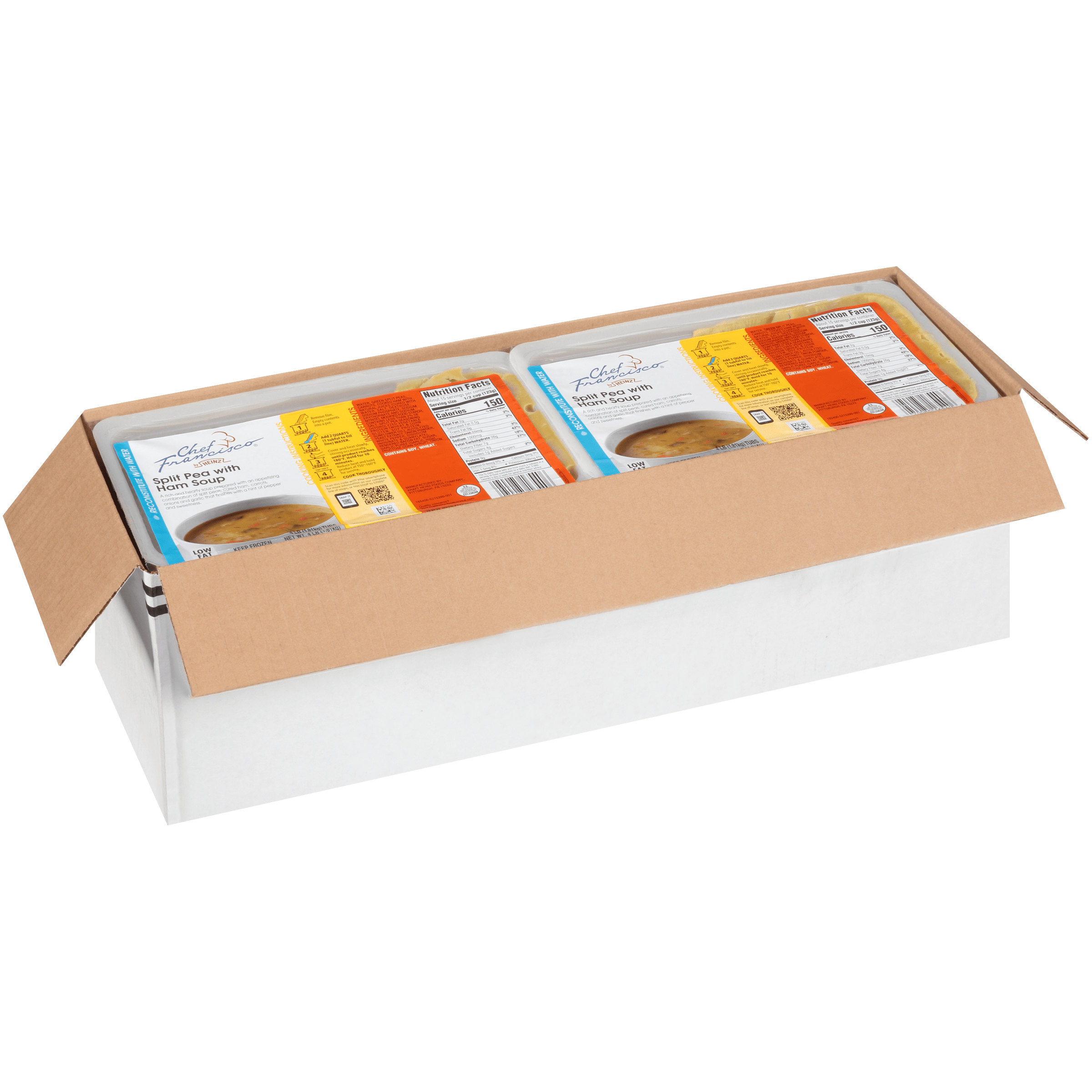 Chef Francisco Split Pea with Ham Soup, 4 lb. Tub, 4 Count. A thick, hearty soup made from a flavourful blend of split peas, carrots and ham. Chef Francisco by Heinz pioneered the concept of frozen soup more than 30 year ago. Heinz understands your need for convenient foods that deliver on nutrition, value and versatility. Who can do all that? Heinz Soups can. Our soups can be your partner in the kitchen, helping you solve the challenges you face every day. With cost-effective options that allow you to be creative in the kitchen for your family, Heinz Soups help you to satisfy nutrition program requirements while you create a multitude of appealing and delicious recipes. Discover Heinz Soups. Meet the demands of USDA guidelines for child nutrition with a variety of soups that can satisfy meal equivalent needs and meet today’s lower-sodium menu requirements—whether served as is, or as an integral part of a tasty recipe.