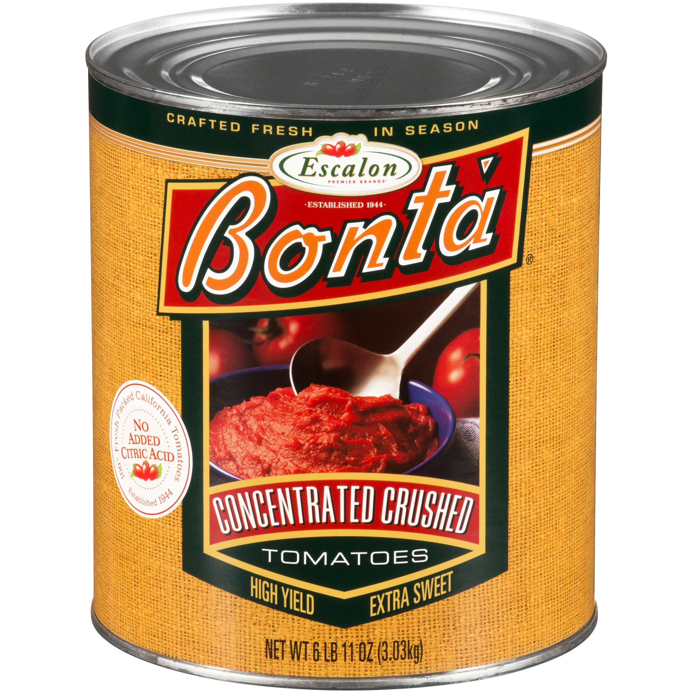 An essential culinary ingredient, Bonta Concentrated Crushed Tomatoes are packaged in 107 oz. cans (6 per case) for extended shelf life and use in large volume recipes. Ideal for use in commercial kitchens, restaurants, cafeterias and more. Made with vine-ripened California tomatoes that are crushed in-season and concentrated to perfect consistency, our bulk product tastes exceedingly fresh and offers a subtle, natural sweetness to complement your signature recipes. Bright red and flavorful, Bonta Crushed Tomatoes are the perfect base ingredient for pizza, pasta sauce, gazpacho and many other Italian, Latin, American and international recipes. At home and away from home, consumers know and love the great taste of Bonta.